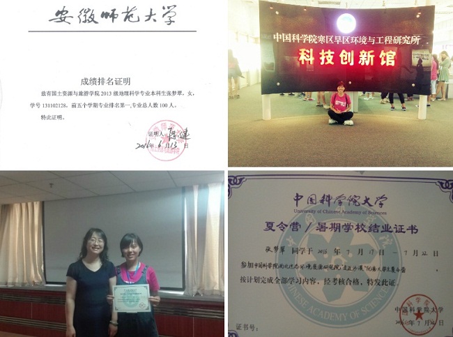 做一名合格党员,要争当先锋模范,起榜样示范作用。2013级地理科学专业学生党员张梦翠,曾连续三年专业课成绩年级第一,获国家奖学金、朱敬文特别奖学金等荣誉。今年暑期,作为学院唯一一名赴中国科学院大学参加学术夏令营的学生代表,凭借在校期间打下的坚实基础和出色的现场表现,更是圆满完成了培训,获得结业证书。