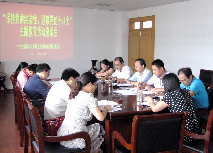8月27日下午,国旅学院在院四楼会议室召开了“保持党的纯洁性、迎接党的十八大”主题教育活动座谈会。学院领导班子成员、各党支部书记、院各办公室成员和全体辅导员参加了座谈会。会议由院党委书记吴春雷主持。