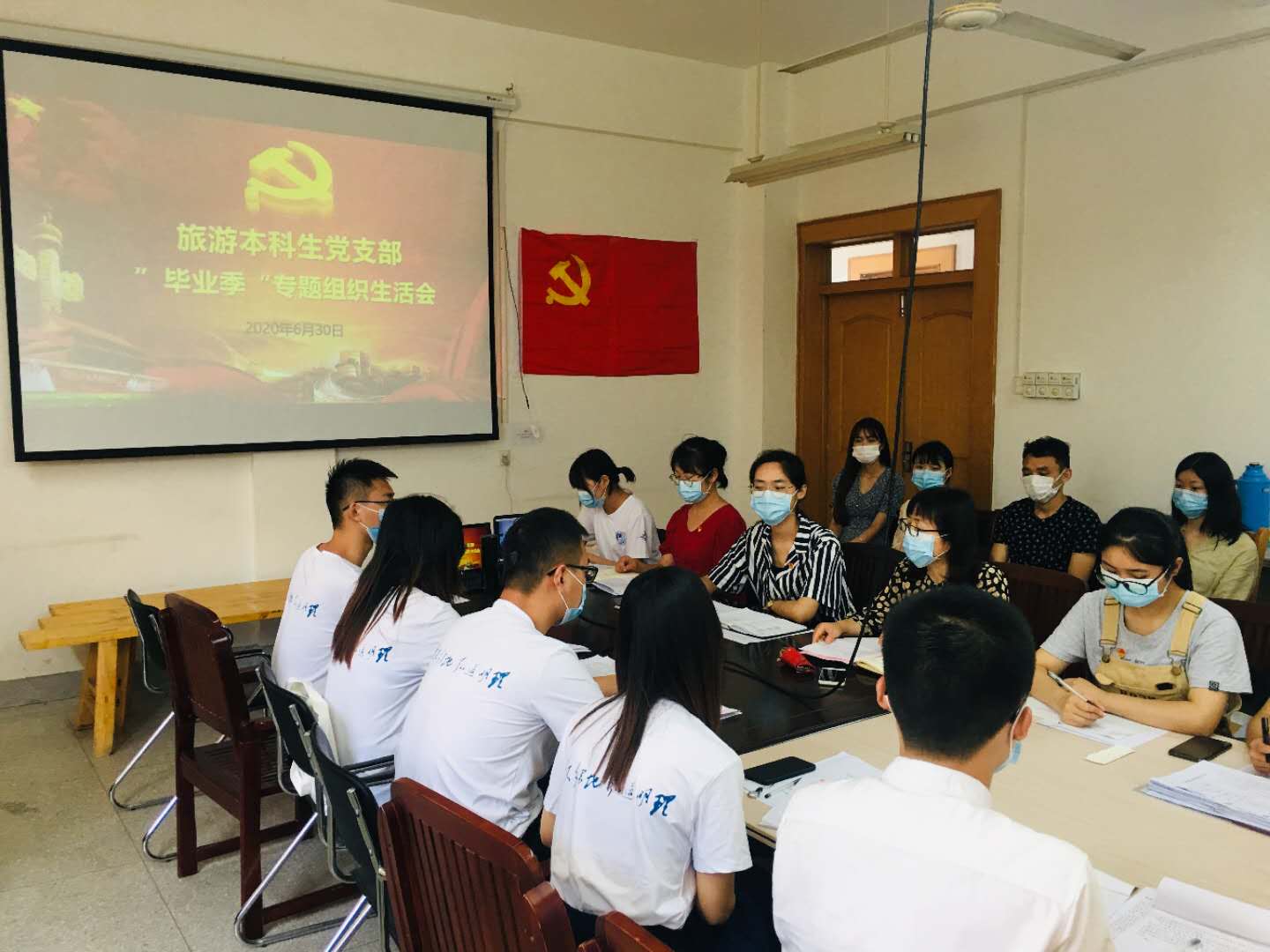 本网讯(地旅学院 陈祥云)为加强毕业生党员教育管理,切实做好毕业生文明离校工作。6月30日下午2:30,旅游本科生党支部在学院行政楼一楼旅游教研室和腾讯会议平台,线上线下同步开展毕业生党员最后一次组织生活会。地旅学院党委常委、副院长赵冬梅,旅游本科生党支部全体毕业生党员共同参会。会议由旅游本科生党支部书记陈祥云主持。