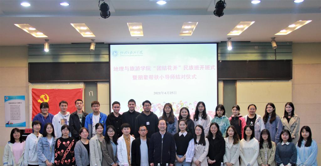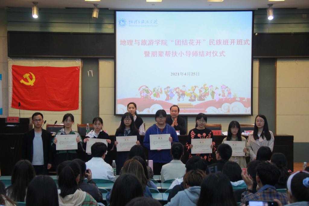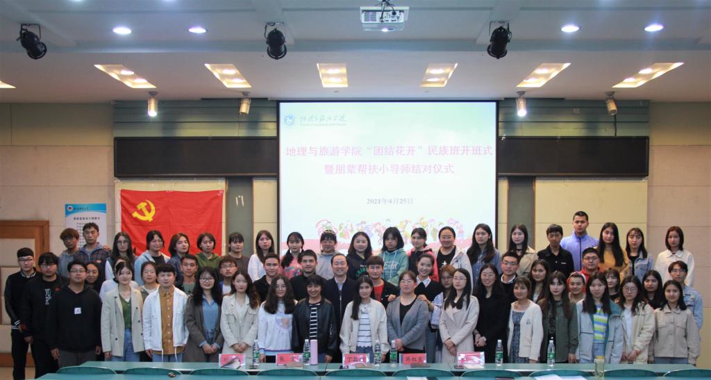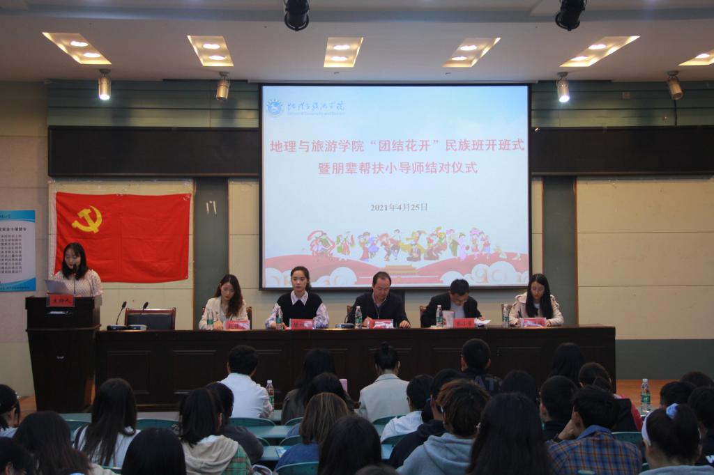 本网讯(地旅学院 赵佳慧 洪茹芊 高星月)为深入推进党史学习教育,切实贯彻全国高校思想政治工作会议精神,积极宣传党的民族政策,促进民族团结,铸牢中华民族共同体意识,进一步切实加强新疆西藏等少数民族学生教育管理服务工作,4月25日晚,beat365英国官方网站首期“团结花开”民族班开班式暨朋辈帮扶小导师结对仪式在院实验楼101举行。地旅学院党委副书记乔静、院团委书记陈祥云,辅导员代表、各民族学生、以及帮扶学生代表出席会议。开班仪式由丁梦瑶主持。