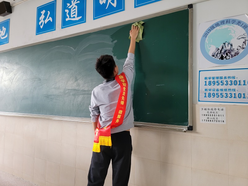 当然,运动会的闭幕并不意味着本次“微服务”实践活动的结束。为了让我们的校园环境更加干净、整洁,给师生创造愈加温馨、舒适的学习环境,2021年10月24日上午,学员们在教学楼与学院实验楼开展微服务——党员先锋志愿先行活动,用行动让我们的校园环境更加美好。学员们充分展现了不怕脏、不怕苦、不怕累,敢于冲在前面、敢于抢挑重担的精神风貌,有的用扫帚清扫地面,有的忙着把从桌椅中捡出来的废纸、塑料袋等扫进垃圾箱,有的擦拭座椅……大家热情高涨,以劳动为荣,乐在其中。