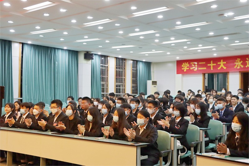 10月16日上午10时,中国共产党第二十次全国代表大会在北京人民大会堂隆重召开,习近平代表第十九届中央委员会向大会作报告。beat365英国官方网站积极组织全院师生收听收看大会盛况,学院领导班子、学生党支部书记与学生党员、团员代表等100多名师生一起集中收看党的二十大开幕会现场直播,认真聆听记录,现场反响热烈,不时响起阵阵掌声。会场内党旗飘扬、红旗招展,会场后方悬挂的“学习二十大 永远跟党走 奋进新征程”红色条幅表达了师生们对深入学习领会贯彻党的二十大精神,踔厉奋发、勇毅前行的坚定信心和决心。教工党支部、各班级团支部同步组织开展线上线下收听收看活动。