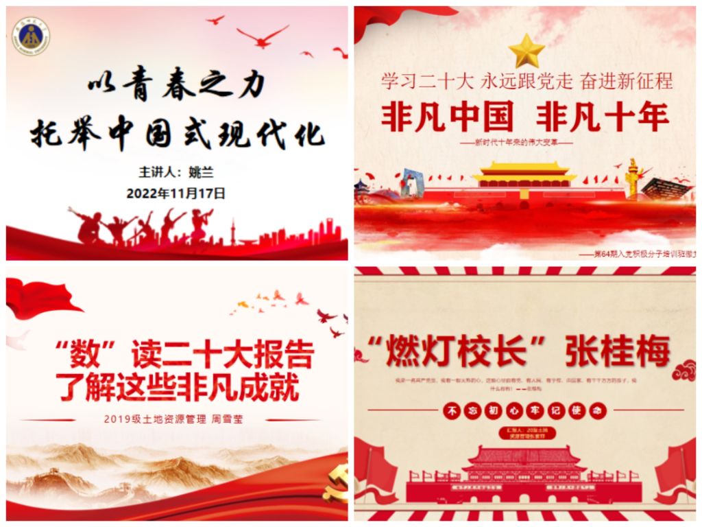 地旅学院切实抓好宣传工作,把学习贯彻引向深入,精心组织多层次、各平台、全方位宣传教育。一是强化宣传阵地管理。通过学院官网、宣传栏、网络新媒体等平台,全面全方位宣传党的二十大精神。二是开展专题报告宣讲。邀请副校长彭凤莲为学院本科生讲授“形势与政策”课暨思政理论课宣讲党的二十大精神;邀请校党委统战部常务副部长刘晓宇为少数民族学子讲授《学习二十大精神 铸牢中华民族共同体意识》专题报告;邀请马克思主义学院副院长李祥兴讲授《以中国式现代化推进中华民族伟大复兴——党的二十大精神学习体会》专题党课;邀请校纪委办案管审理室主任刘长生讲授《学习党内法规 严守党的纪律》专题党课。三是精心组织宣讲活动。依托《地旅学院学生党员先锋“五微五计划”活动实施方案》,举行“学习二十大 永远跟党走 奋进新征程”主题“微党课”宣讲和评比活动,引导预备党员、入党积极分子宣讲典型人物、事迹,明晰青年使命;组织学生党员、入党积极分子观看《二十大观察》《十年·答卷》《领航》等纪录片;举办“青春献礼二十大 强国有我新征程”之“青春之声”红歌演唱微视频录制活动;举办党的二十大精神学习体会“微分享”,鼓励学生用微博、微信、腾讯QQ等微媒体平台实时分享党的二十大学习感悟等活动。通过形式多样的宣传方式,让师生党员以身作则学报告、谈认识、谈心得、讲收获,确保学习宣传入脑入心,切实将党的二十大精神学习成果转化为实际行动。