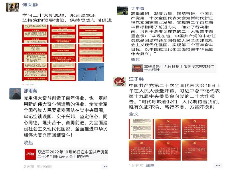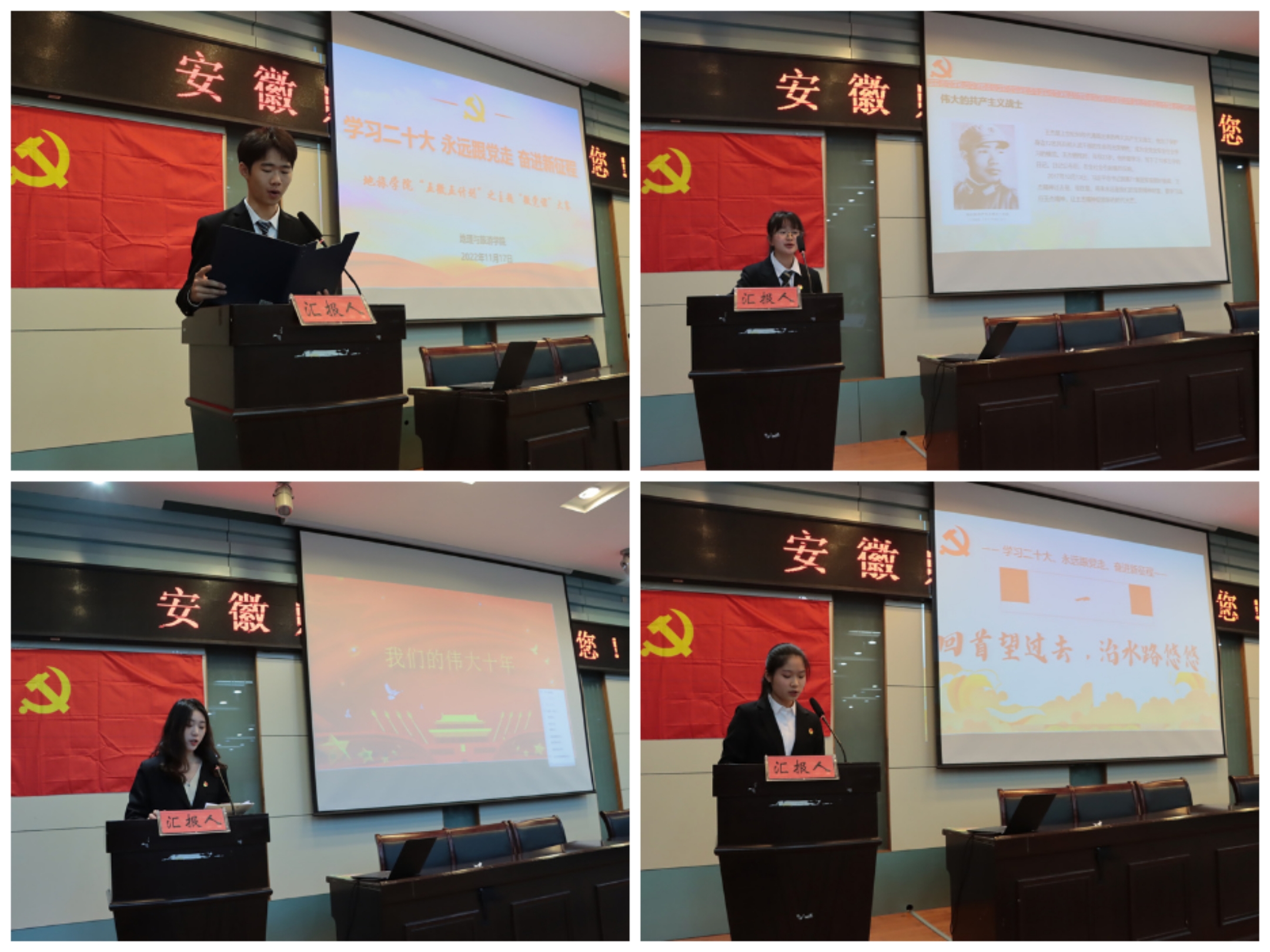 从专题学习研讨到主题党日、团日活动,从理论学习到举办“微党课”比赛,从网上答题到线下测试问答,地旅学院掀起学习宣传贯彻党的二十大精神的热潮。一是学习做到多层次、全覆盖。在党委带领下采取会议专题学、教职工大会集中学、支部大会学、在线收看学、个人自主学等各类学习会议50余场,做到师生全员参与。二是打造多样化宣讲队伍。全方位、多角度宣传解读党的二十大精神,党委班子带头讲,重在精神鼓舞和思想启迪;专家学者深入讲,聚焦理论深度和重点维度;先锋模范讲示范,聚焦真理之光和青年之责,共计形成专题党课和微党课课件、讲稿250余份,红歌传唱视频10余部。三是创建常态化宣讲载体。将宣讲融入党团活动环节,引导讨论交流;将宣讲融入专业实习,打造行走的思政课堂;注重线上云端宣讲,打破传播瓶颈,拓展宣讲辐射群体。四是擦亮特色品牌、发挥典型示范。做实做新新时代高校党建“双创”全国党建工作样板支部创建示范、“五微五计划”、“送党课到实习点(实践地)”等学生党建品牌活动,将党性锻炼与素质拓展相结合、将理论学习与社会实践相结合,确保党员教育管理成效;持续推进“团结花开”少数民族学生联系培养关怀教育工程,首位参军入伍的在校维吾尔族大学生阿卜来提·阿卜力克木获校第18届“师大骄子”十佳大学生标兵、教育部大学生就业创业典型人物事迹表彰以及安徽省2023年“十佳”“百优”大学生推荐;发挥“榜样的力量”,开展“地旅风华”典型引路育人项目暨“百瑞德风华奖学金”评选,在学生群体中形成创先争优、示范引领良好氛围;在疫情防控政策调整关键期,22位党员教职工积极响应党委号召,在关键时刻克服困难、迎难而上,全力保障2023年全国硕士研究生招生考试考务工作,以实际行动践行党的二十大精神。