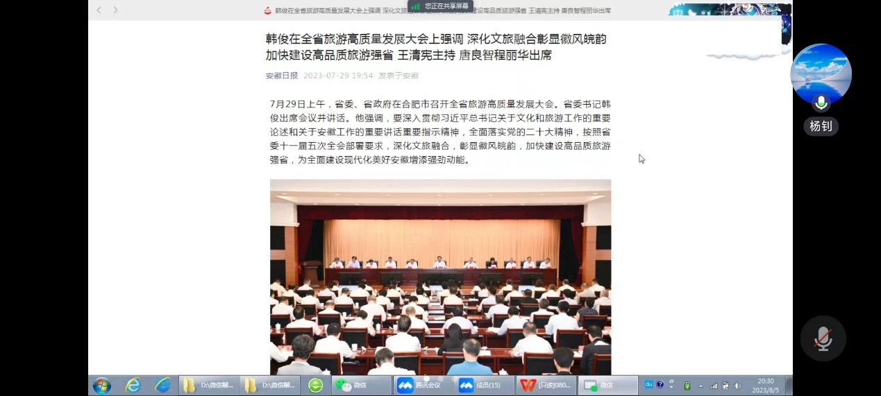 视频课程结束后,支部副书记杨钊老师传达了7月29日安徽省委、省政府在合肥市召开全省旅游高质量发展大会的精神,并对《中共安徽省委 安徽省人民政府关于深化文旅融合彰显徽风皖韵加快建设高品质旅游强省的意见》进行解读。