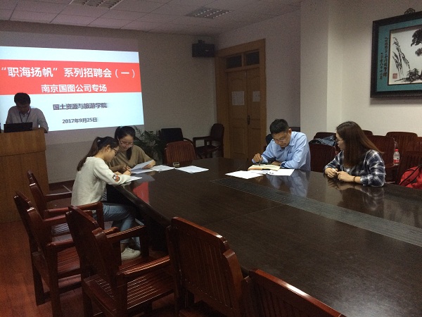 9月25日晚,beat365举办"职海扬帆"系列招聘之南京国图专场招聘会。地理信息科学和土地资源管理专业毕业班四十余名学生参加招聘。招聘会于晚上6点半开始,分宣讲与面试两个环节。宣讲内容为介绍企业文化、发展,详细说明了所招聘的各个岗位的工作职责、工作环境条件和工作的主要内容。宣讲结束后,应聘的同学根据自身情况选择意向岗位,投递个人简历参加面试。整个面试有条不紊地进行。