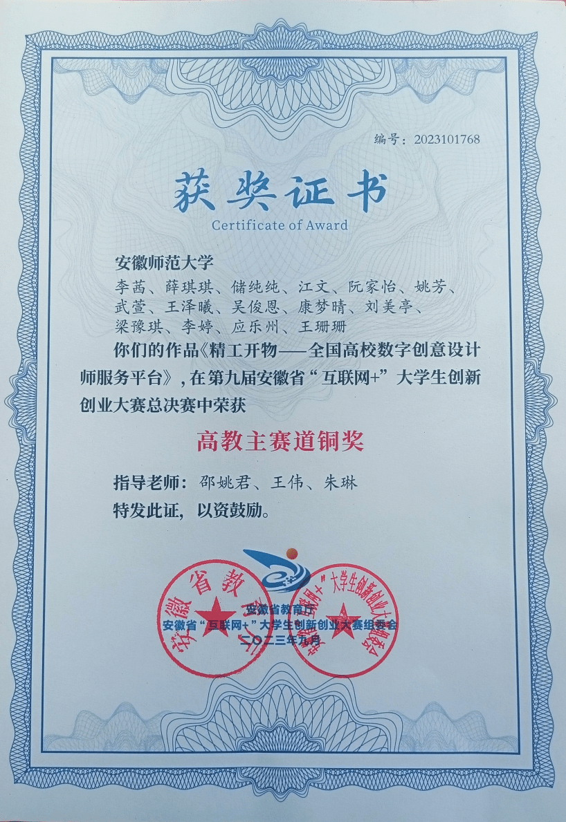 第九届安徽省“互联网+”大学生创新创业大赛高教主赛道铜奖