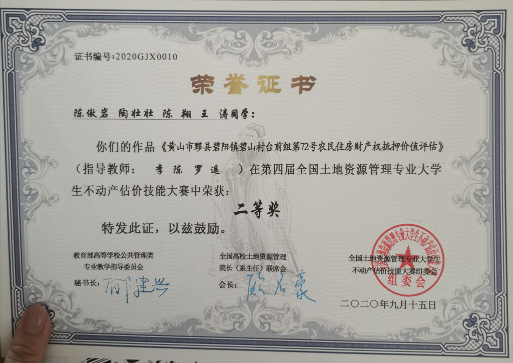 第四届全国土地资源管理专业大学生不动产估价技能大赛二等奖