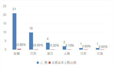 2018年,从地理科学专业签约单位地域分布来看,选择在安徽工作的毕业生人数为30人,占签约就业毕业生人数的58.8%。在省外签约就业人数为21人, 占签约就业毕业生人数的41.2%,具体毕业生就业区域分布详见图2: