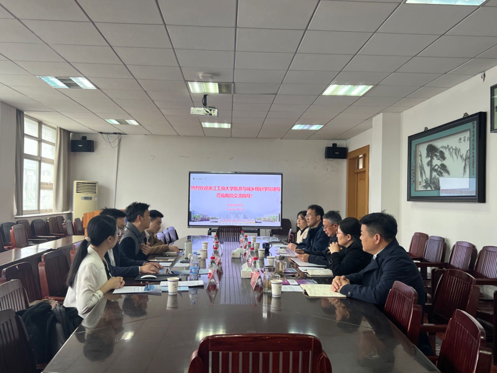 贾冠忠对项国鹏一行来院调研交流表示欢迎,表示两校位置相邻、定位相近,都为所在省份的文旅人才培养贡献了力量,有着良好的合作基础,并表示未来在教学、科研和社会服务等方面加强合作,充分发挥各自优势,服务地方经济社会发展。项国鹏介绍了浙江工商大学旅游与城乡规划学院在学科建设、人才培养方面的情况,希望双方共同推动长三角旅游管理学科联盟发展,并在研究生招生、师资博士后推荐和推动校政企合作等方面加强合作交流。会上,与会人员围绕双方今后合作内容、合作路径、合作模式等方面进行了深入探讨,达成了进一步合作意向。