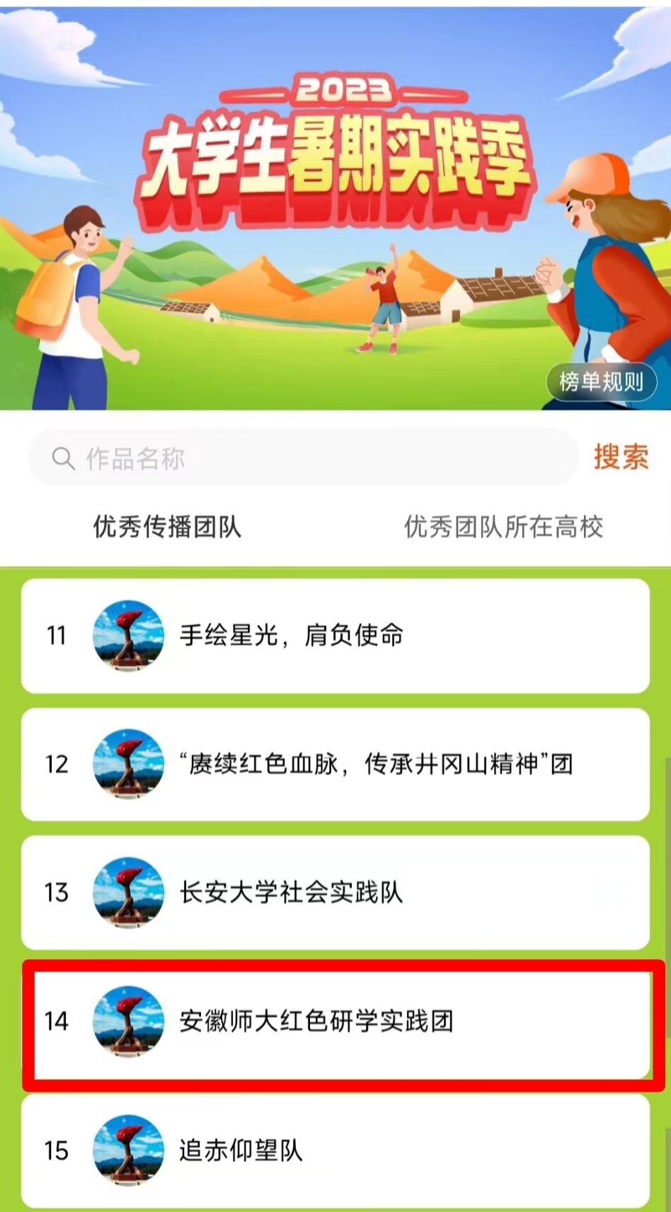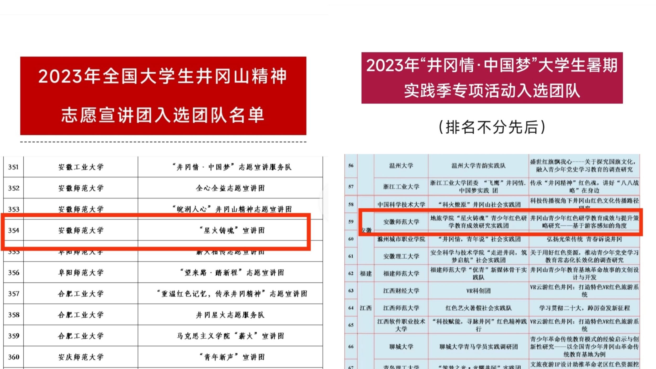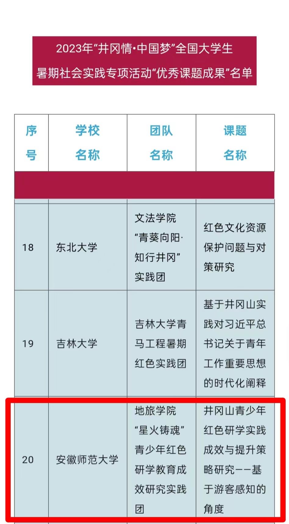 近日,团中央公布了2023年“井冈情·中国梦”全国大学生暑期社会实践专项活动优秀课题名单,我校地理与旅游学院申报的星火铸魂红色研学实践团(调研课题为《井冈山青少年红色研学实践成效与提升策略研究--基于游客感知的角度》)喜获该项目“优秀课题成果”。经过层层筛选和评审,全国共有38支团队获此殊荣,安徽省高校仅2支队伍入选。