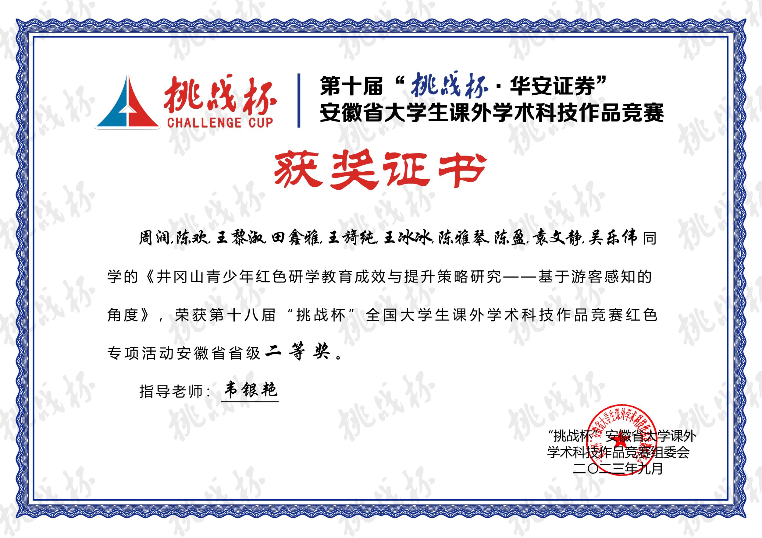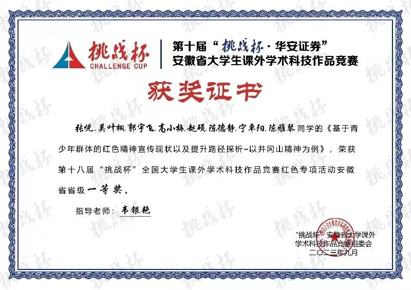 团队调研总时长达200余小时,形成有效问卷1023份,访谈材料227份。《井冈山青少年红色研学与教育成效与提升策略研究--基于游客感知的角度》获评“井冈情·中国梦”暑期实践季优秀课题结项、第十届“挑战杯”安徽省大学生课外学术科技作品竞赛红色专项省二等奖,《基于青少年群体的红色精神宣传现状以及提升路径探析--以井冈山精神宣讲为例》获第十届“挑战杯”安徽省大学生课外学术科技作品竞赛红色专项省一等奖。