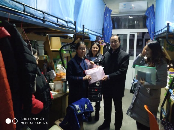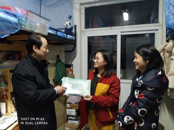 学院为考研学子准备了考试所需的签字笔、尺子等全套考试文具。在走访过程中,乔书记带领辅导员将慰问品发放到一位位考研学子手上。小小礼品袋里装满了学院老师对考研学子的满满关怀。乔书记热心询问同学们的考研复习进度以及所遇到的困难,鼓励大家在最后的几天备考中要坚定自己的梦想,持之以恒,以健康的心态和身体迎接考试,超越自我,实现梦想。