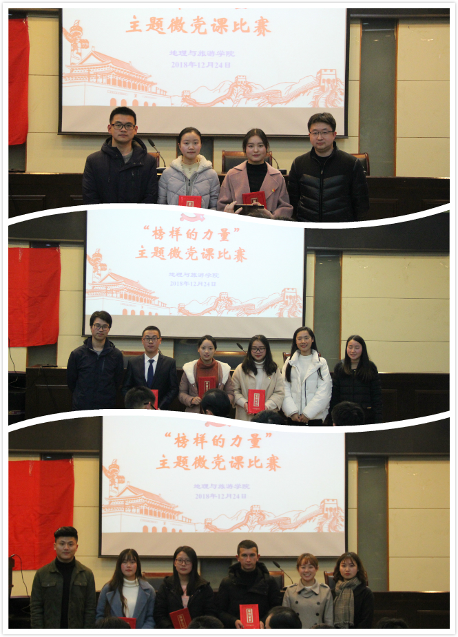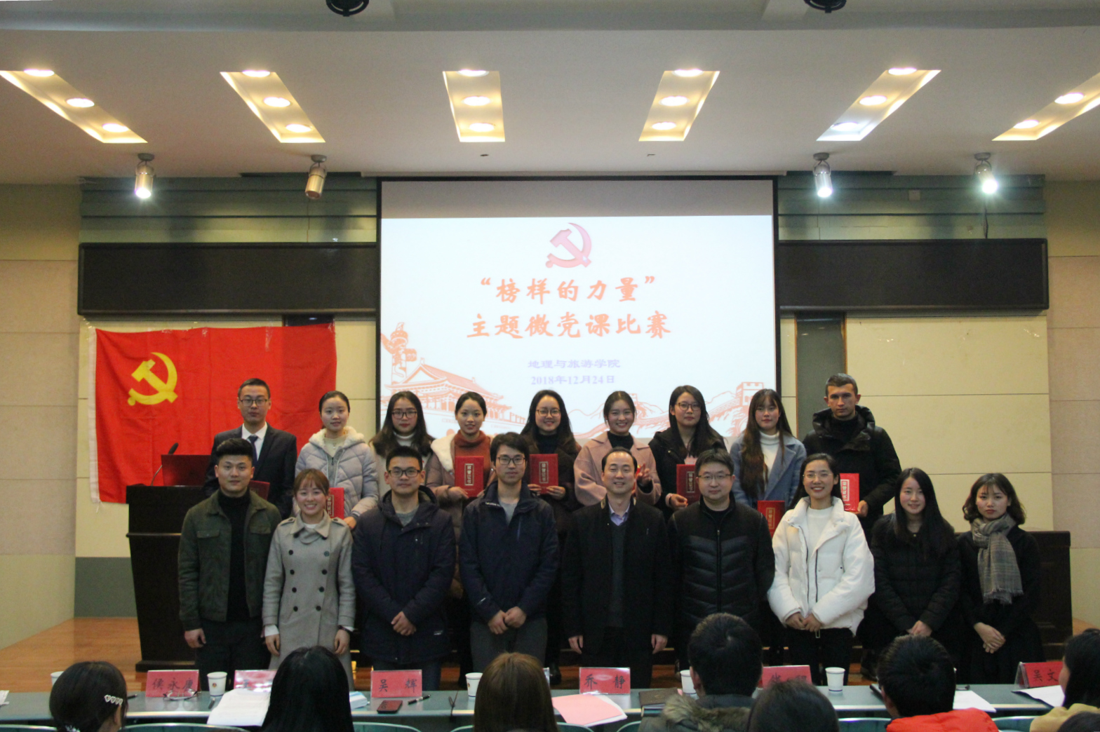 本网讯(地旅学院 侯永康、尹仟仟)12月24日晚7时, 地旅学院在该院实验楼101报告厅举行“五微五计划”学生党建活动之“榜样的力量”主题微党课比赛。院党委副书记乔静、院本科生党支部书记、全体专兼职辅导员到场并担任评委,学院全体学生党员及学院分党校第26期入党积极分子培训班全体成员到现场观摩学习。