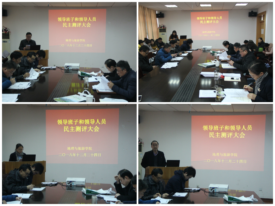 12月24日下午,地旅学院领导班子和领导人员2018年度考核述职测评大会在院三楼会议室举行。会议由院党委书记贾冠忠主持,全体教职工参加会议。
