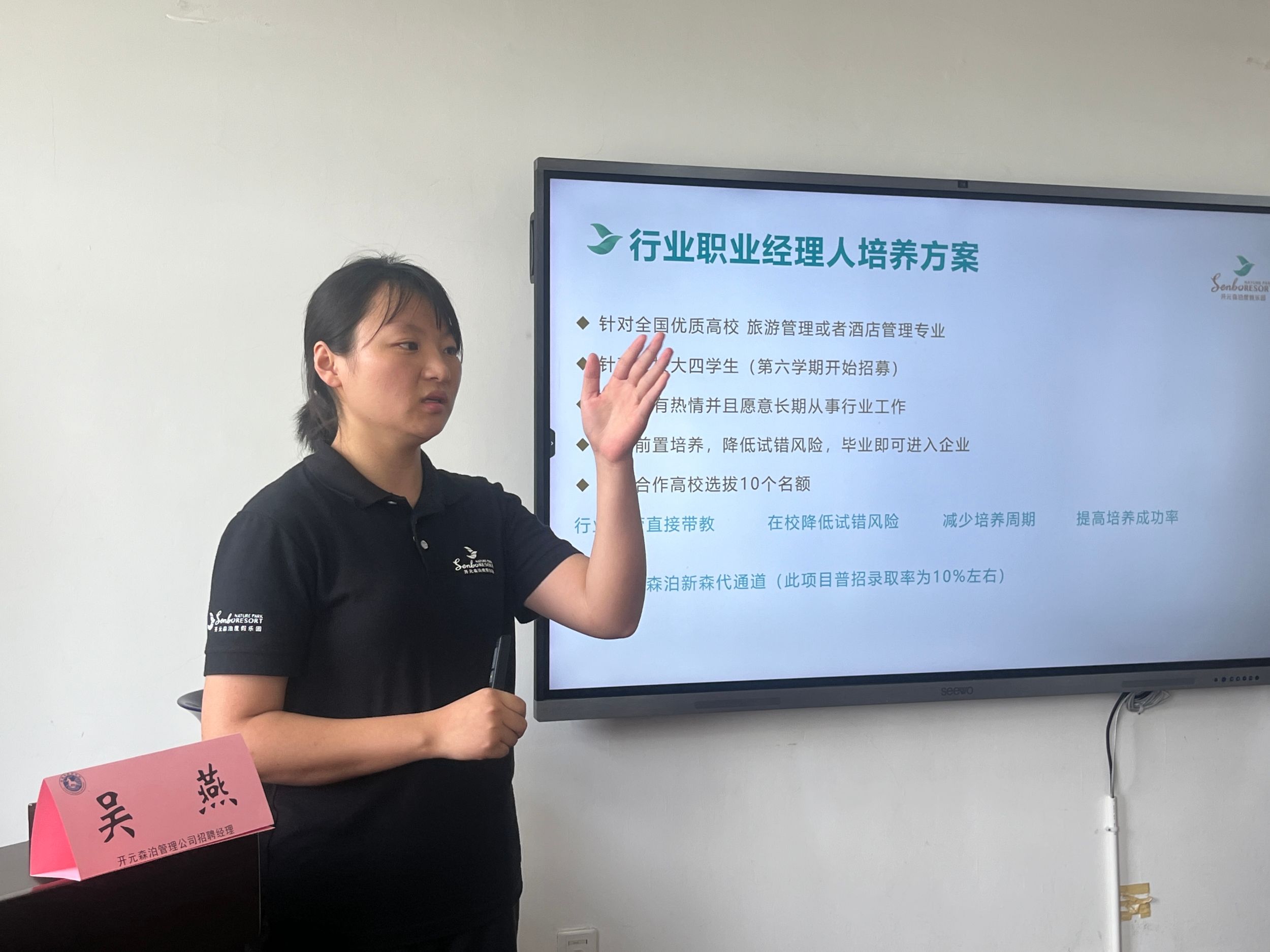 吴燕经理围绕开元旅业集团、森泊度假乐园和“旅游职业经理人培育计划”人才培养方案展开介绍。开元旅业集团以酒店为主导产业,同时拥有房产、乐园、商业、工业、文旅等产业,开元森泊度假乐园是开元旗下的大型旅游度假综合体品牌。入选“旅游职业经理人培育计划”的学生将优先进入森泊新森代通道。介绍后,同学们热情高涨,与陈静总监等企业高管交流互动。陈静总监对地旅学院旅游管理专业学生的综合素质表示肯定,并鼓励同学们在校期间多参加行业认知实习,珍惜机会,在求职赛道上提前抢跑。
