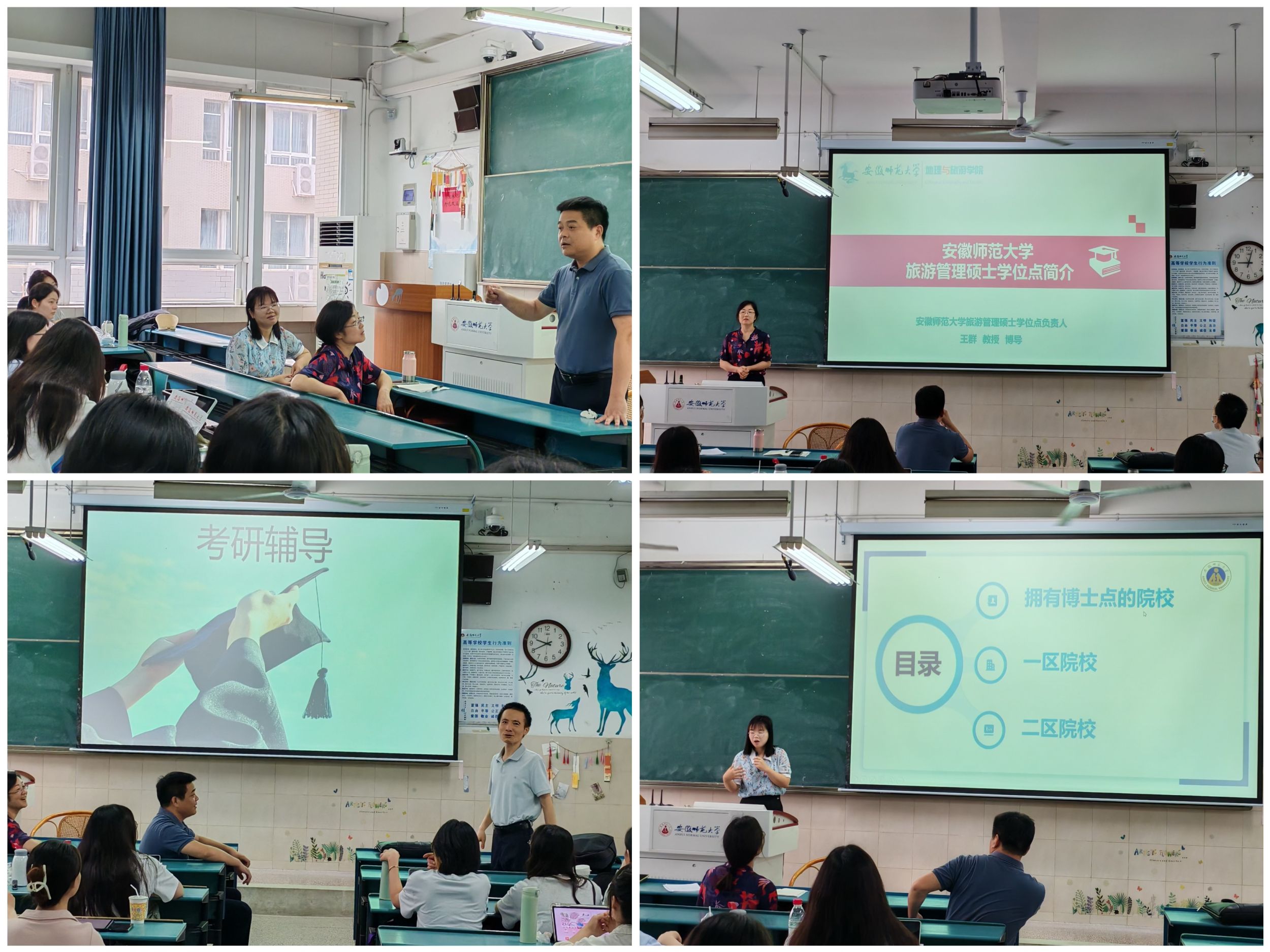 6月21日上午,旅游管理专业在教学楼2040202教室举行2025届考研辅导会。专业负责人尹寿兵、旅游管理专业硕士点负责人王群、专业老师黄剑锋、洪学婷走进学生教室与学生深度交流。洪学婷老师全面介绍了本专业全国硕士招生院校的相关信息,王群老师向同学们介绍了beat365英国官方网站旅游管理专业硕士点及近年来的招生情况,黄剑锋老师鼓励同学们之间要交流经验,共同进步。尹寿兵老师表示后续将为同学们复习考研尽可能提供更好、更个性化的服务,助力大家坚持到最后一刻。会议结束后,同学们纷纷表示获得了很多的报考信息,也对学院和专业提供的帮助感到暖心,并表示一定认真备考,坚持到底。