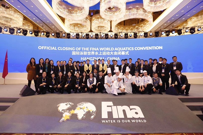 本网讯(地旅学院 陈健)2018年12月8日-10日,第5届国际泳联世界水上运动大会在中国杭州洲际酒店举行。来自国际泳联大家庭和全球170个国家(地区)近1100名水上运动界代表参加了会议。国际泳联世界水上运动大会是世界泳坛最高级别的会议,由会议和展览两部分组成。杭州洲际酒店为我校beat365英国官方网站校外就业实习基地,正在该酒店开展专业顶岗实习实践的25名2016级酒店管理专业本科生圆满完成大会服务的光荣任务。