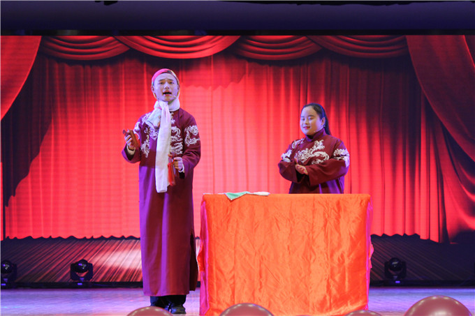 智斗》中,表演者们粉墨登场,唱念做打间国粹的魅力尽显,余音绕梁,韵味悠长;小品《归雁》以学院赴川支教十年的志愿队伍川队为原型,以山区教学现状为背景,根据真实故事改编,讲述山区支教点滴,倾诉十年志愿真情,感动了现场观众,而故事原型川队首批志愿者王娟、“归雁反哺”的李媛媛也发来信件与视频,表达对川队十周年的深切祝福、对大家新一年的美好祝愿;歌曲《少年中国说》中,学院十位教职工子女们动情朗诵,激昂伴唱。李雨林豪迈领唱,携中华少年们阐发少年声音、诠释少年责任。