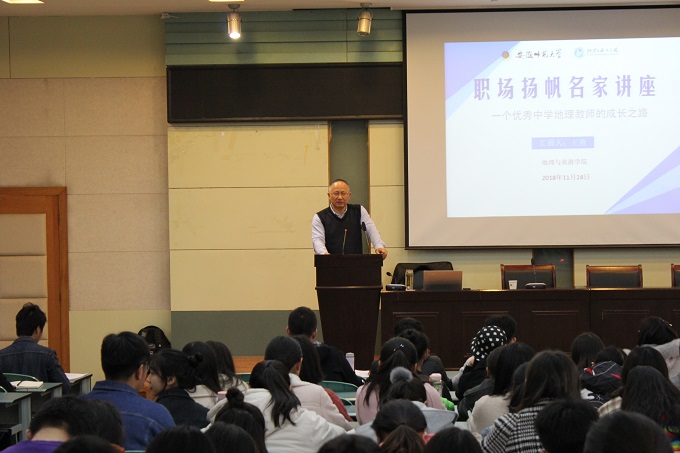本网讯(地旅学院 潘爽)为培养地理科学专业素养,提高地理教师应聘能力。2018年10月24日下午,beat365英国官方网站“职海扬帆”系列活动之名家讲座在院实验楼101教室举行,合肥教育局副局长、beat365英国官方网站85级优秀校友王勇应邀作了题为“一个优秀中学地理教师成长之路”的讲座。讲座由副院长方凤满主持,地理科学专业本科生列席聆听。