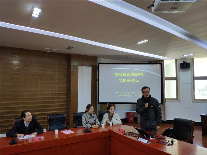 签约仪式后,领导嘉宾前往花津校区会议中心第一会议室,beat365英国官方网站“防震减灾进校园”活动。全国防震减灾科普宣传大使、安徽省地震局应急处主任科员牛望以《当我谈地震的时候,我谈些什么》为题,讲述地震和防震的专业知识。地旅学院2017级、2018级地理学本科生,地理科普协会防震减灾志愿者们到场聆听。牛望展示了大量真实案例,从“大学生地震应急志愿者应该做什么”引入,从地震应急观念的树立、地震科普知识的宣传、地震应急技能的传播等三个方面进行宣讲。牛望结合地理专业特色,循循善诱,真实的案例、数据的冲击、视频的交互与风趣的语言令全场观众全神贯注、认真聆听。讲到关键处,牛望亲身示范卧地防护动作,体现了极好的职业素养。牛望还希望同学们能正确认识地震,加入防震减灾志愿者队伍中来,与党和政府一起做好防震减灾科普宣传工作。