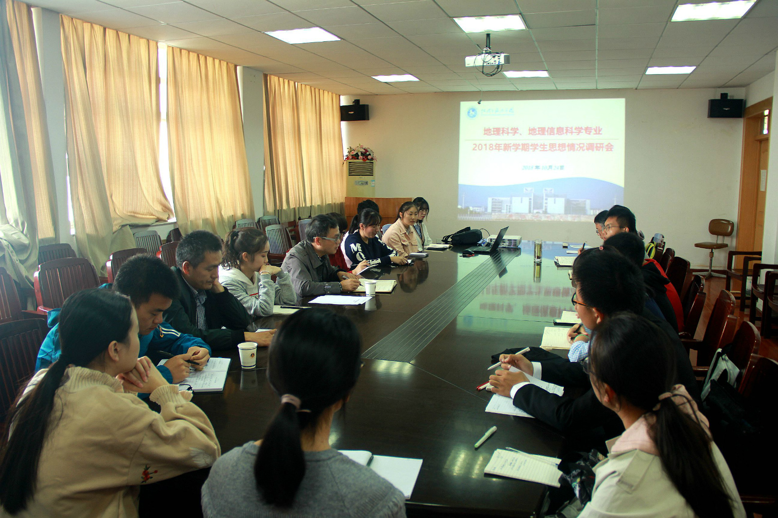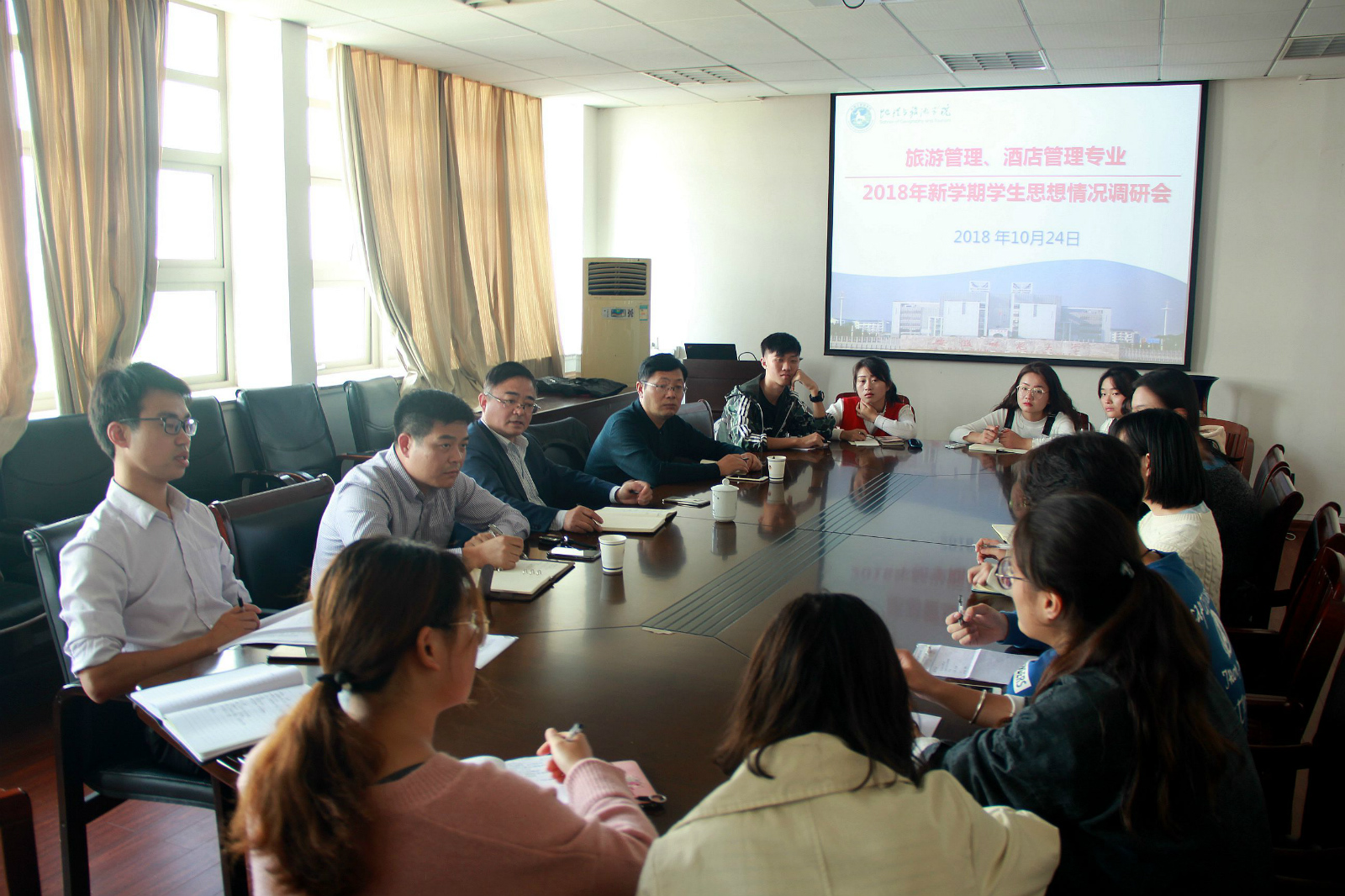 本网讯(地旅学院 侯永康)为了贯彻落实学校《关于开展新学期学生思想情况调研工作的通知》的文件精神,进一步优化新学期学生管理,深入倾听学子心声。10月24日下午,地旅学院召开2018年新学期学生思想调研师生座谈会,座谈会按照专业分三个分会场同时展开。地旅学院领导班子全体成员、各专业负责人、全体专兼职辅导员、各年级学生代表参加了本次座谈会。