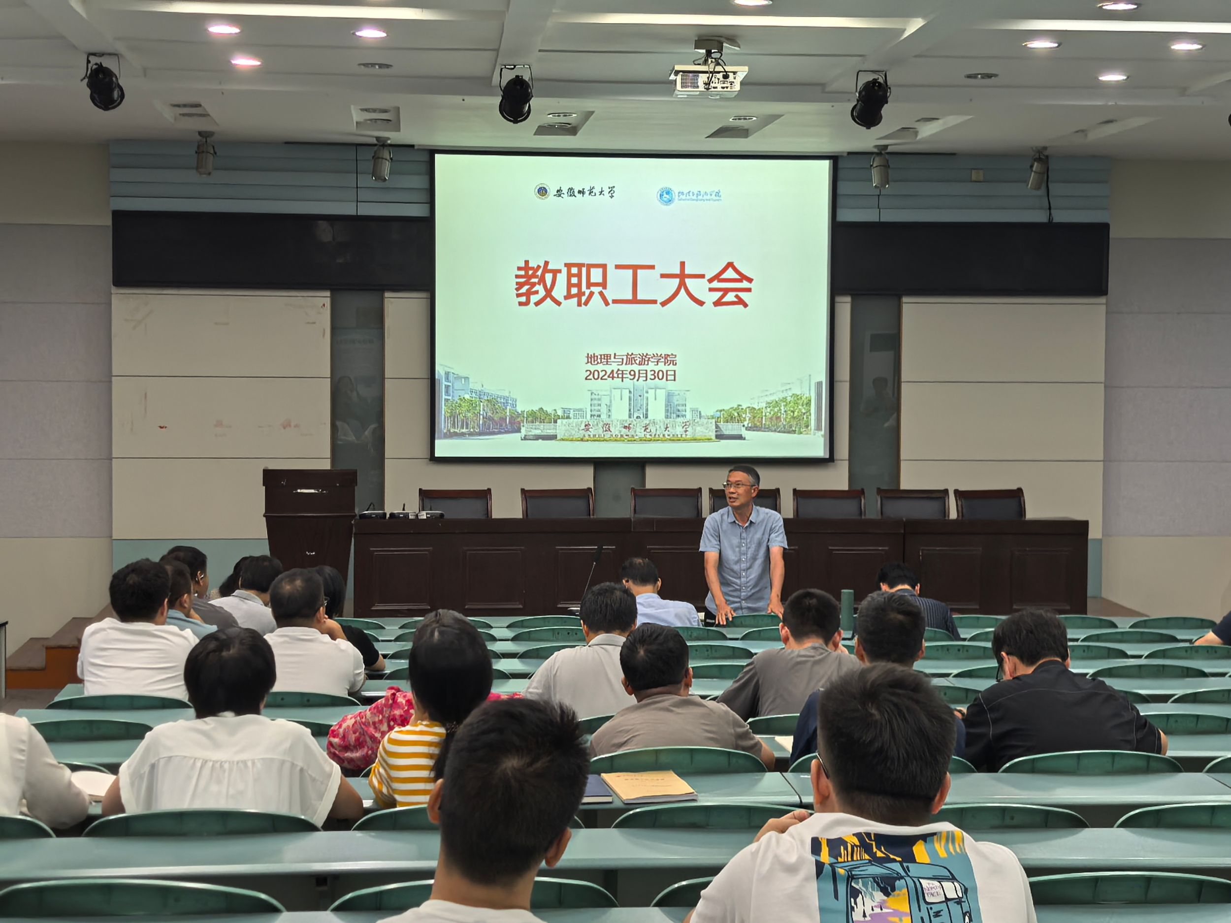 9月30日下午,地旅学院在实验楼101报告厅召开全院教职工大会。专题学习党的二十届三中全会精神,传达学习全国教育大会精神,布置近期重点工作。学院全体教职工参加会议,会议由院长方凤满主持。