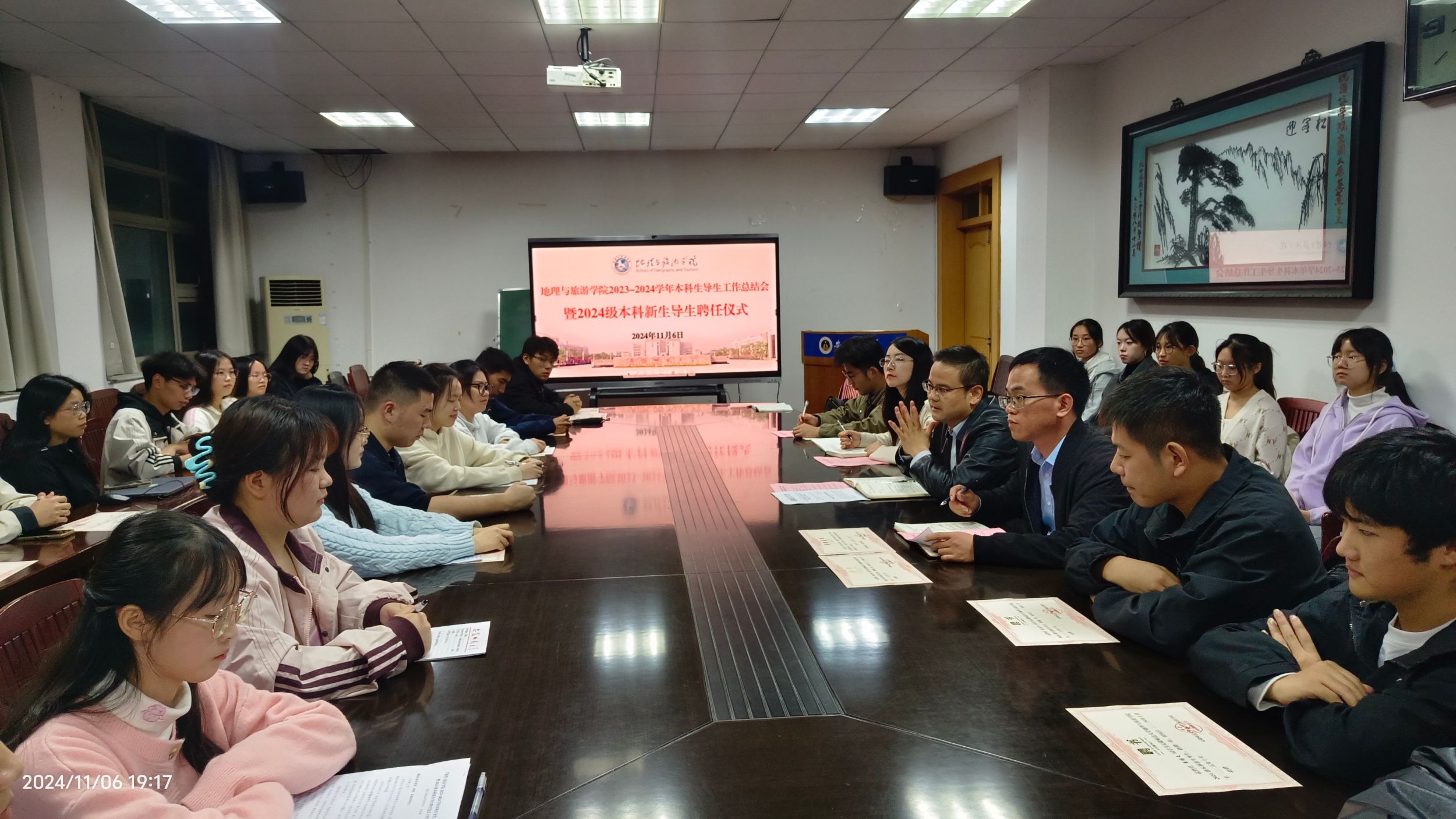11月6日晚,beat365英国官方网站在学院行政楼三楼会议室举行2023-2024学年本科生导生工作总结会暨2024级本科新生导生聘任仪式,beat365英国官方网站党委副书记付勇,2024级本科新生辅导员彭媛媛、沈涵,2023级优秀本科生导生以及2024级本科新生导生参加会议。会议由beat365英国官方网站2023级本科生辅导员齐小学主持。