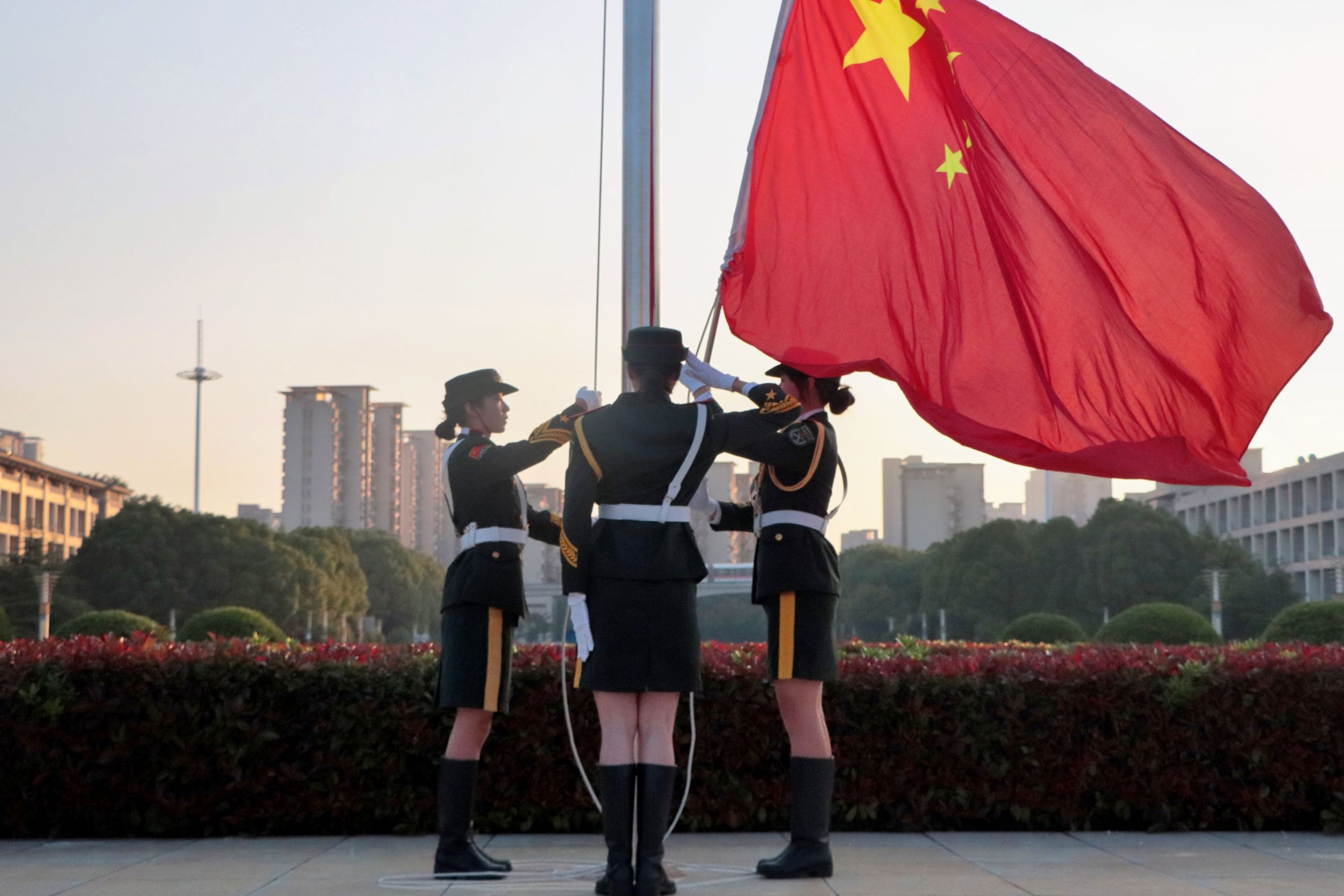 旭日初露,煦色韶光,升旗仪式正式开始。国旗护卫队迈着铿锵有力的步伐,护送着五星红旗走向旗杆。随着《义勇军进行曲》的奏响,五星红旗冉冉升起。全体师生肃立,行注目礼,齐唱国歌。