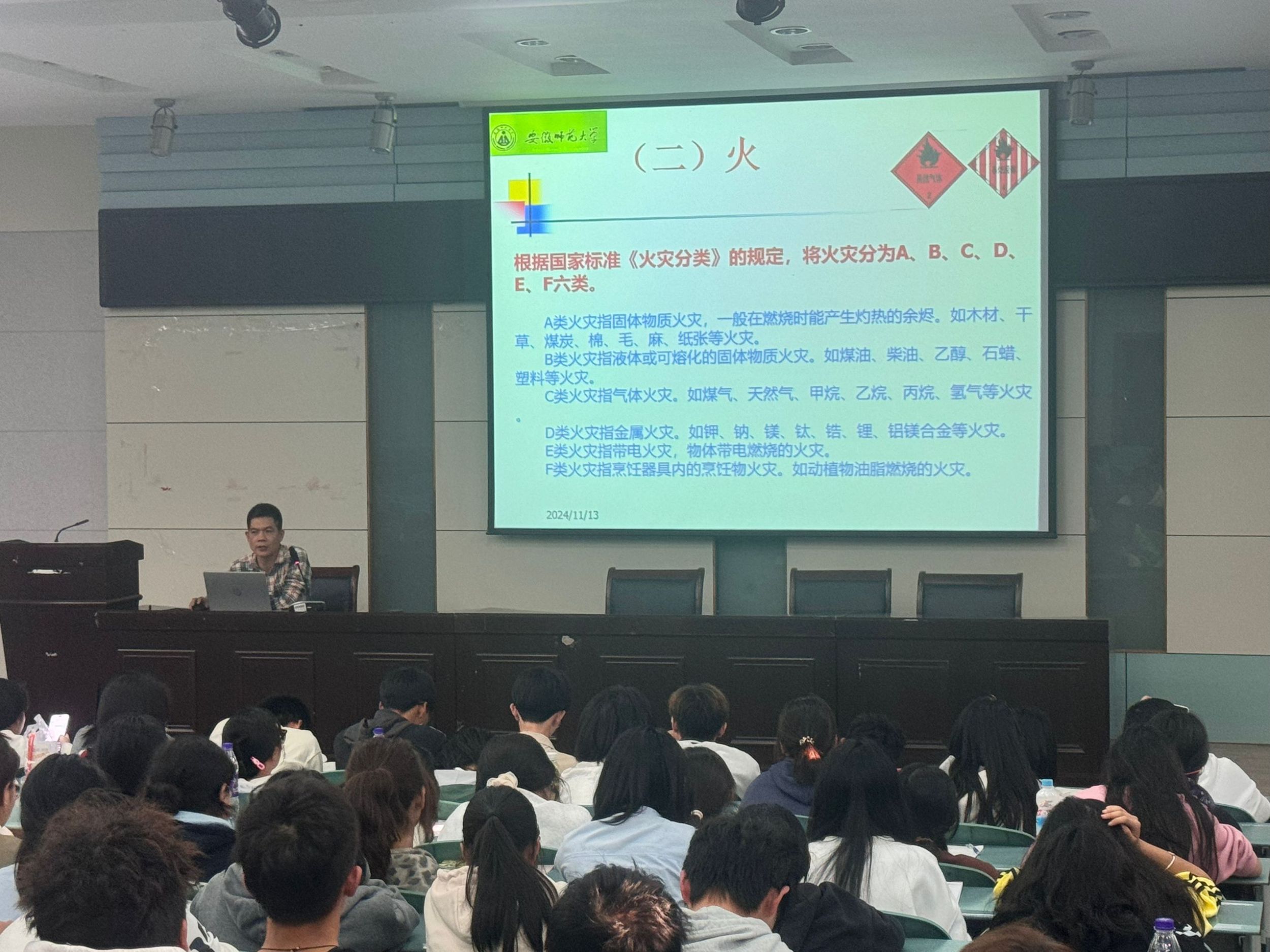 张平究以“责任重于泰山,安全高于一切”为开场,强调了实验室安全的重要性。首先介绍了近年来高校频发的实验室安全事件,从实际案例出发指出实验室安全管理的重要性和必要性,强调生命安全是实验操作的第一要素;接下来他根据自己多年的实验室工作经验,结合真实案例,为同学们分析了实验室中可能存在的各类安全隐患,从常见化学品的特性与正确使用、储存方法,到精密仪器设备的规范操作流程;从电气设施的安全使用要点,到消防设施的正确使用与火灾应急处理方式,让在场师生对实验室安全规范、设施设备要求、使用管理要求、应急处置措施等方面有了进一步的认识和提高。最后,张平究对本次讲座进行了全面总结,并再次强调了实验室安全的重要性,要求同学们将讲座中学到的知识内化于心、外化于行,严格遵守实验室的各项规章制度。同时,鼓励同学们相互监督、相互提醒,形成一个安全意识浓厚、行为规范有序的良好氛围。