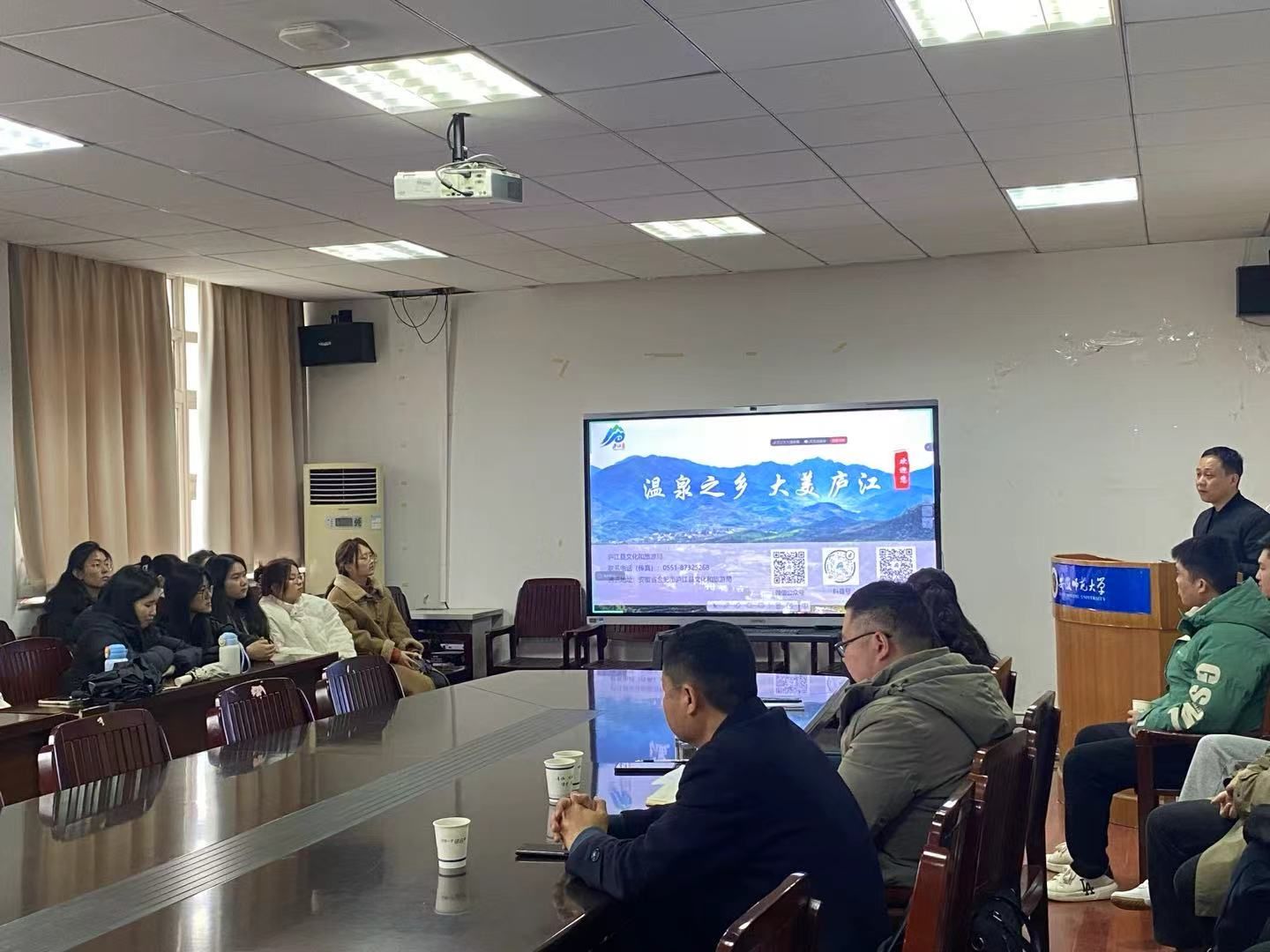 3月5日,合肥市庐江县纪委驻县委宣传部纪检组组长黄炯携庐江县文旅局副局长顾晓龙、庐江县人社局人才综合服务中心主任张平安、庐江县乡投公司资产运营部工作人员周越、庐江县乡投公司资产运营部工作人员张泽瑞等一行前来beat365英国官方网站开展文旅人才专项座谈交流暨事业单位招聘政策宣讲会,学院院长方凤满、党委副书记付勇、旅游管理专业负责人尹寿兵、2025届毕业班和大三年级学生代表参与。