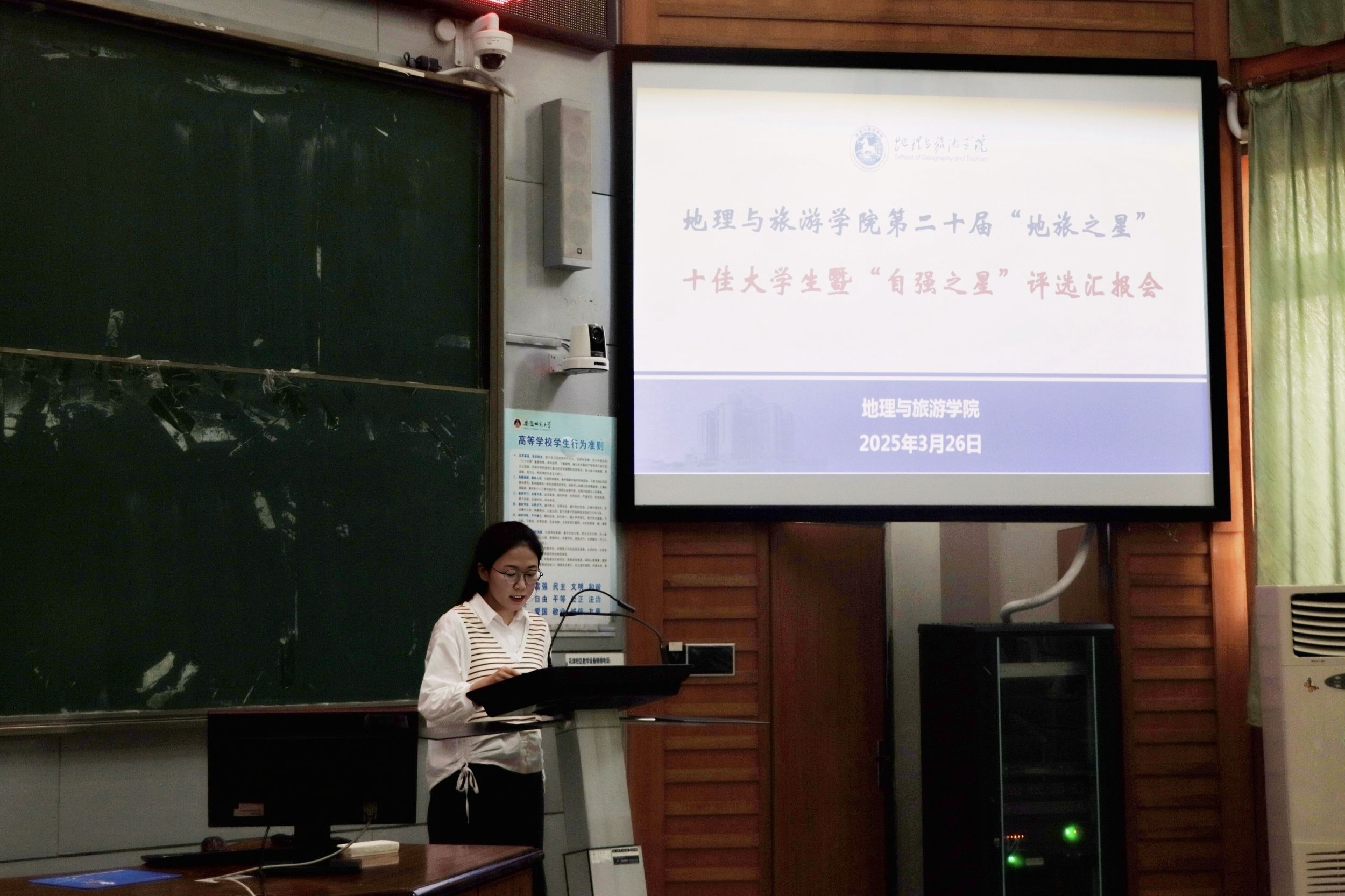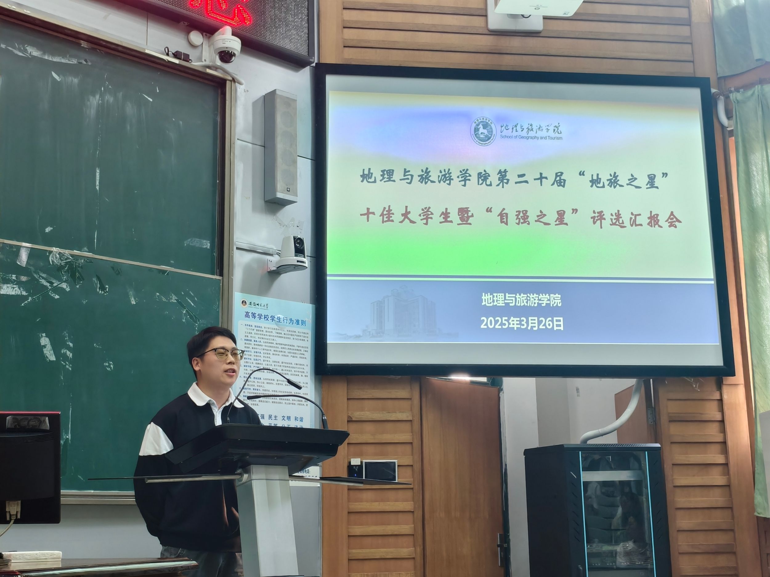 为全面推动落实“大学生护航行动计划”,表彰鼓励2024-2025学年表现突出的优秀学生,发挥引领教育作用,激励广大青年学生成长为有理想、敢担当、能吃苦、肯奋斗的新时代好青年,3月26日下午,beat365英国官方网站于行知楼1号楼105报告厅举行第二十届“地旅之星”十佳大学生暨“自强之星”评选活动。学院党委副书记付勇,学院团委负责人以及各专业辅导员老师代表出席活动并担任评委,各班学生代表现场聆听并参与评审。