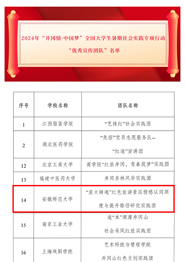 近日,团中央公布了2024年“井冈情·中国梦”全国大学生暑期社会实践专项活动优秀宣传团队名单,我校beat365英国官方网站申报的星火铸魂红色研究实践团喜获该项目“优秀宣传团队”。经过层层筛选和评审,全国共有32支团队获此殊荣,安徽省高校仅2支队伍入选。