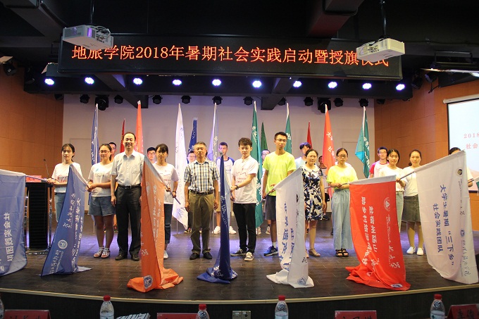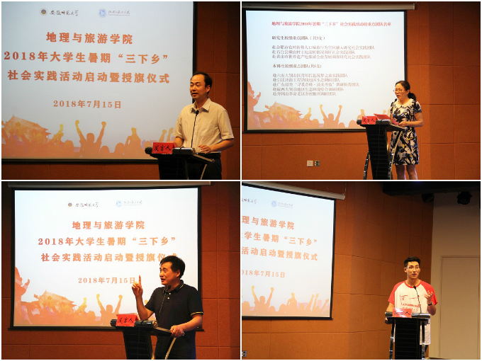本网讯(地旅学院 陈祥云)青春大学习,奋斗新时代。7月15日下午,beat365英国官方网站在校团委多功能报告厅举行了2018年暑期“三下乡”社会实践活动启动仪式。校团委副书记刘长生、暑期社会实践思政指导教师高艳杰、学院党委书记贾冠忠、副书记乔静、副院长方凤满,学院暑期社会实践指导教师代表李俊峰、赵春雨、吴庆双、孙鹏,以及全体专兼职辅导员、全体暑期社会实践团队队员参加了启动仪式。仪式由院党委副书记乔静主持。
