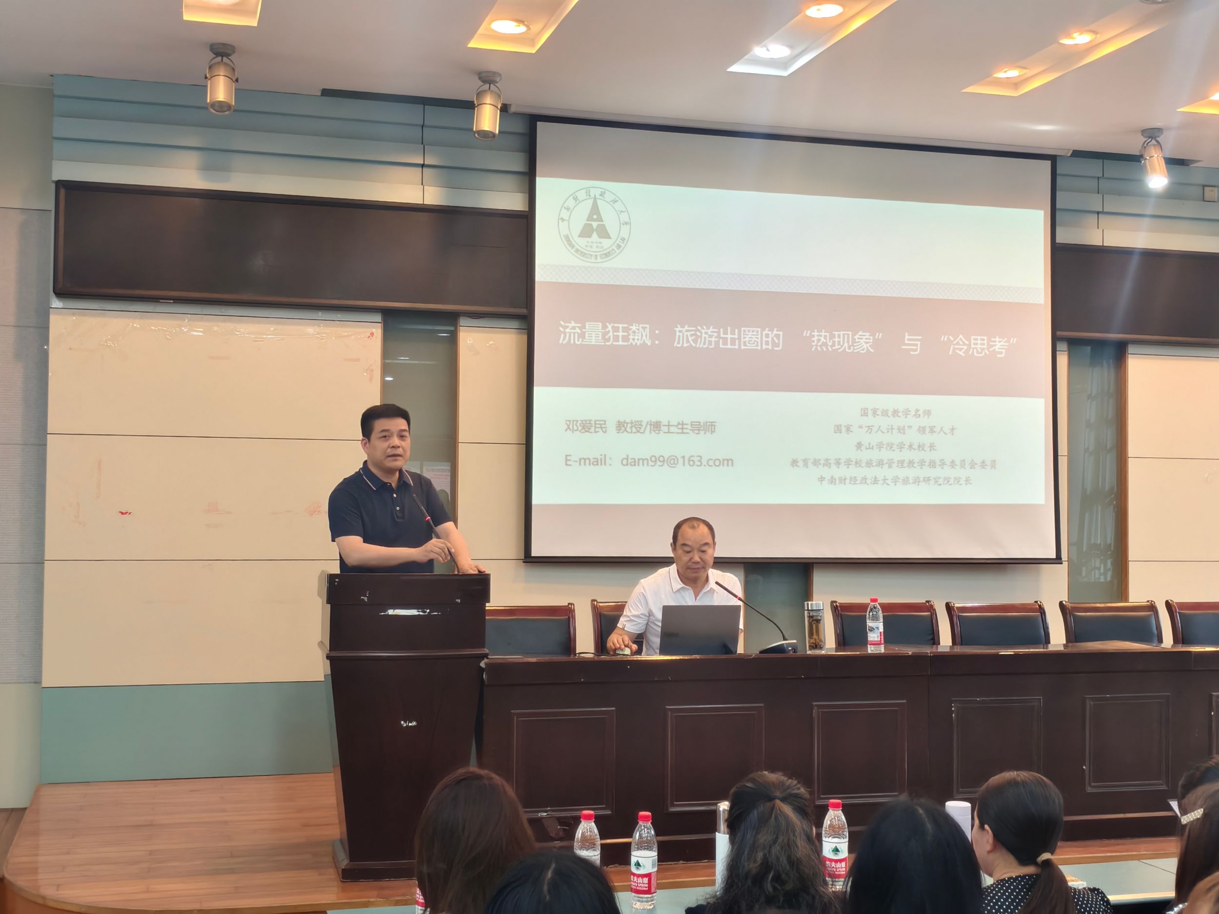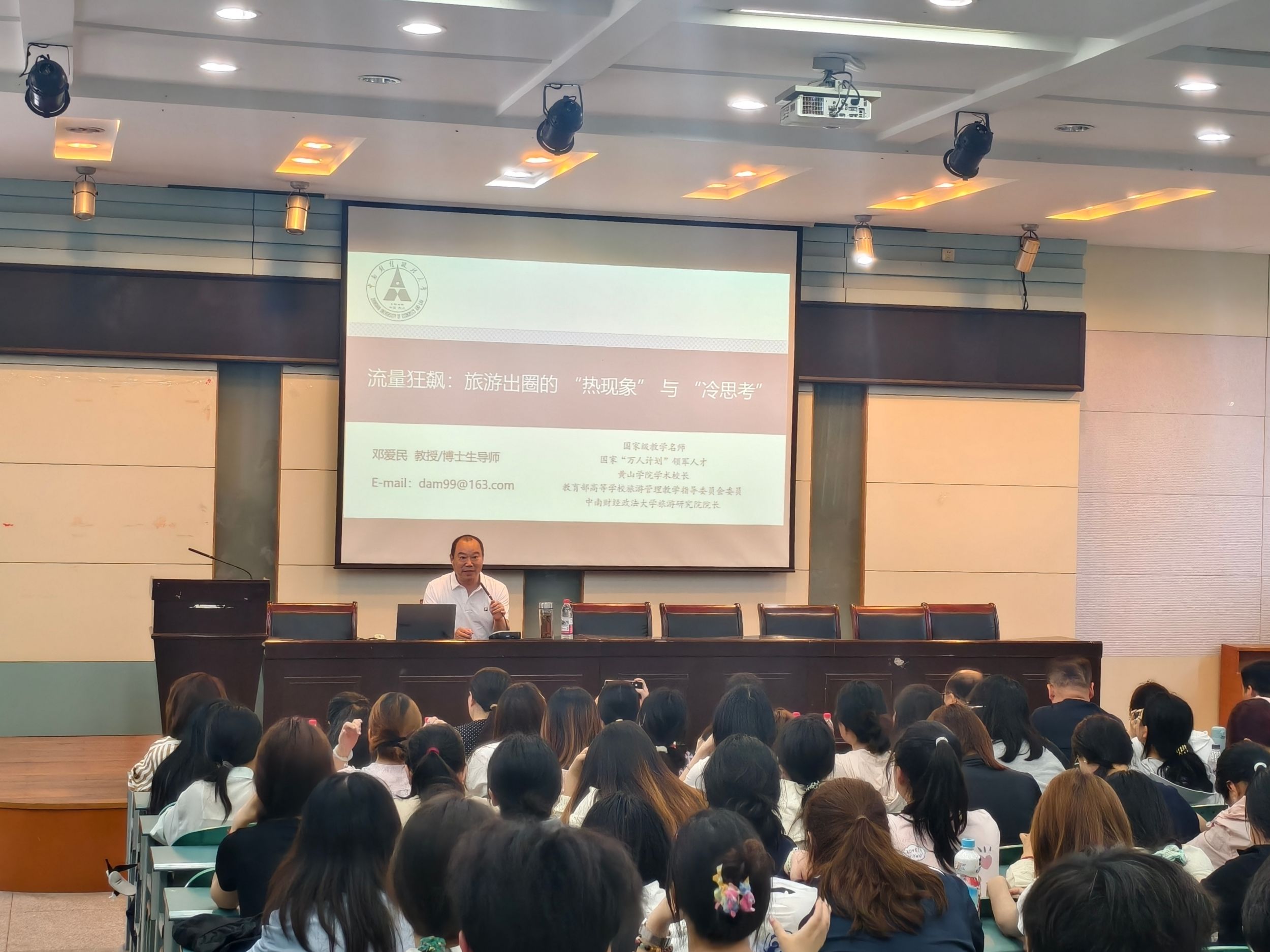 为深化旅游管理学科内涵建设,促进学术思想碰撞与行业前沿洞察,强化学生专业思想认同,地旅学院于5月14日举办第11期“学•思•享”大讲堂。本期活动特邀国家教学名师、中南财经政法大学工商管理学院博士生导师、旅游管理专家邓爱民教授担任主讲嘉宾,以“旅游出圈的热现象与冷思考”为主题,为学院师生带来一场兼具理论深度与实践启发的学术盛宴。报告由beat365英国官方网站副院长杨兴柱主持。