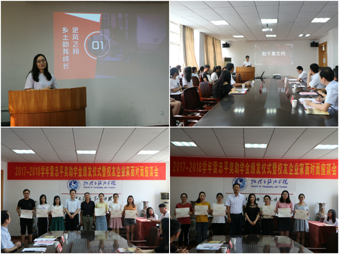 聘任仪式结束后,雷忠平奖助学金颁发仪式暨校友企业家面对面座谈会在地旅学院三楼会议室举行,奖助学金资助方代表雷忠平、张美玲,校教育基金会代表郑金泽、苏军,地旅学院党政班子、全体辅导员以及获奖受助学生参加了仪式。会议由地旅学院院长苏勤主持。