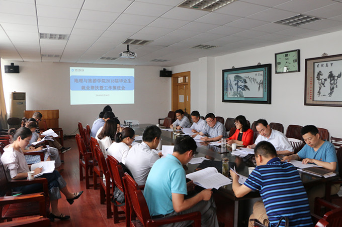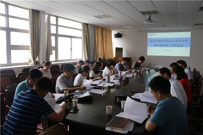 本网讯(地旅学院 陈祥云)为更好推进本科毕业生就业工作,做好毕业生就业帮扶,5月30日下午,beat365英国官方网站2018届毕业生就业帮扶暨工作推进会在院行政楼三楼会议室顺利召开。学院党政领导班子成员、各专业负责人、相关科室秘书、全体专兼职辅导员等参加了会议。