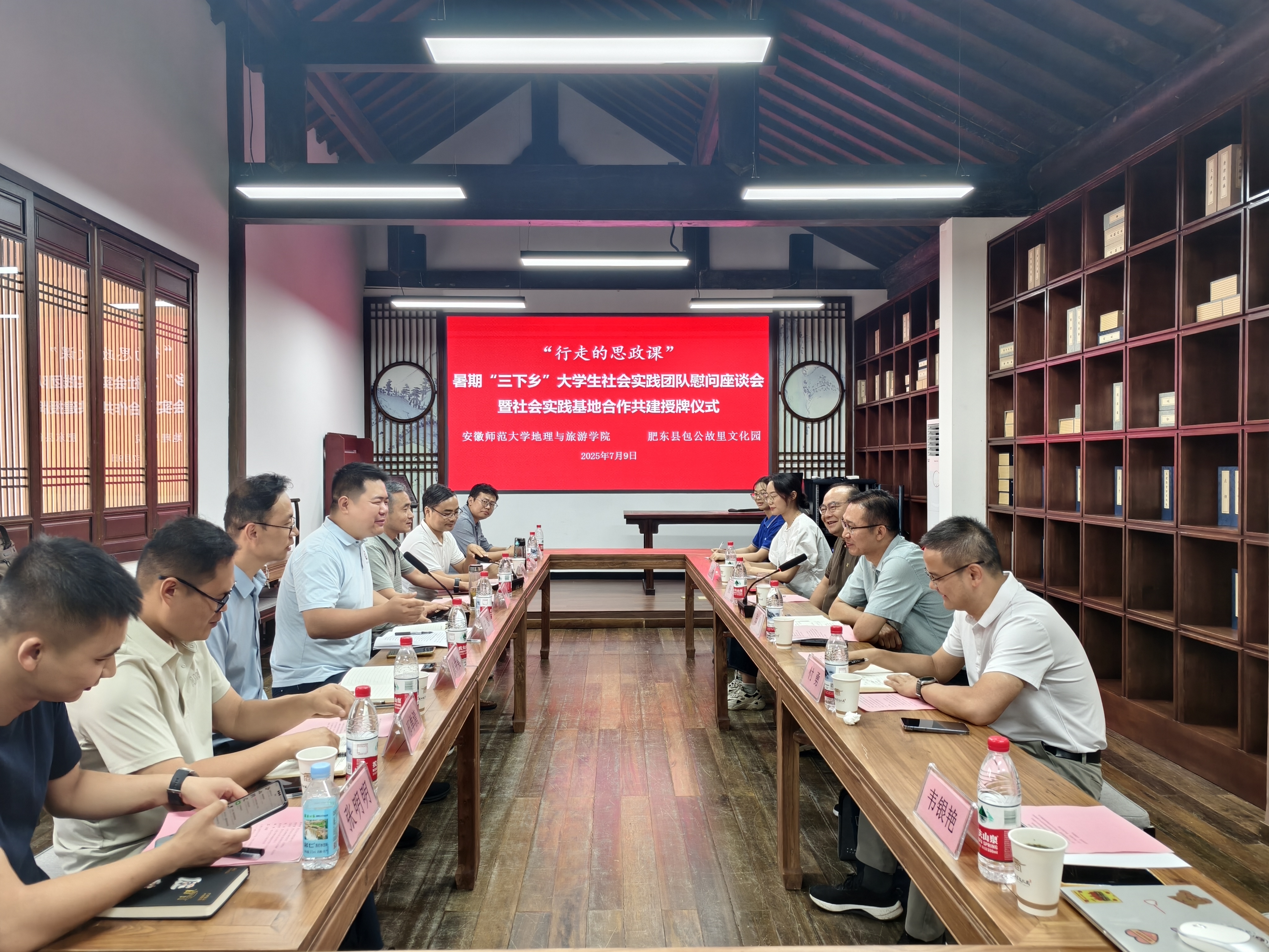 7月9日下午,beat365英国官方网站beat365英国官方网站党委书记张顺、党委副书记付勇、旅游管理专业教师杨钊一行来到包公故里文化园,亲切慰问地旅学院赴合肥“正气庐州路,青春信仰行”社会实践团队的全体师生。肥东县包公镇党委书记、我校2014届旅游管理专业校友王磊,党委副书记、我校徐井美,文旅办副主任张燕,合肥东部新城文旅传媒有限公司董事长黄俊华等陪同,并举办beat365英国官方网站赴合肥“正气庐州路,青春信仰行”社会实践团队慰问座谈会暨社会实践基地合作共建授牌仪式。活动由合肥东部新城文旅传媒有限公司副总经理王家发主持。