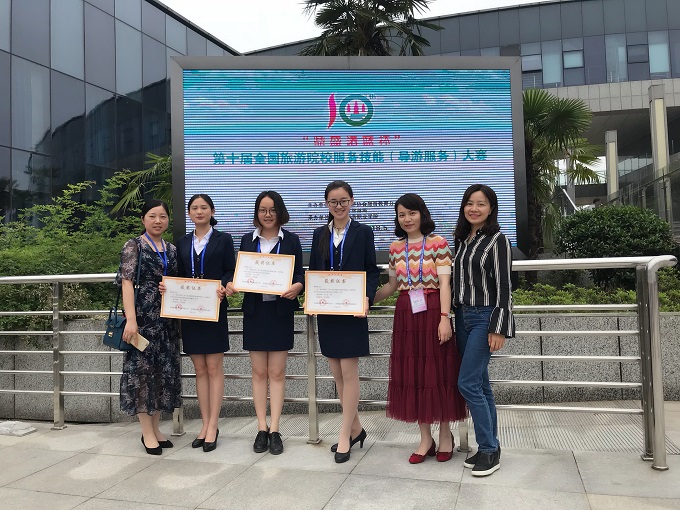 本届大赛共有来自全国31个省、自治区、直辖市的371所高等院校和中职学校的1160名选手报名参赛,众多院校派出代表观摩、学习和交流。大赛分为高等院校、中职学校两个组别,设置普通话导游服务、英语导游服务两个赛项,从理论考核、中英文导游讲解和才艺展示三大环节展开了角逐。大赛聘请61位权威专家担任裁判,并经过大赛组委会裁判组规范的评分程序,根据选手的导游讲解技能、思维逻辑、形象气质等多方面进行综合评分。来自地旅学院的四位参赛选手从开学初便开始认真准备,学院秉承“以赛代训、以赛促学”的专业素养培养理念,由王咏、吴悦、刘云霞等三位老师全程担任指导老师,围绕比赛的各个项目和细节进行全方位指导,与选手一同前往杭州比赛现场,给予专业指导,关心选手生活,帮助调节情绪。四位同学则从容应战,以专业娴熟的讲解、优雅从容的姿态获得评委组的一致好评。