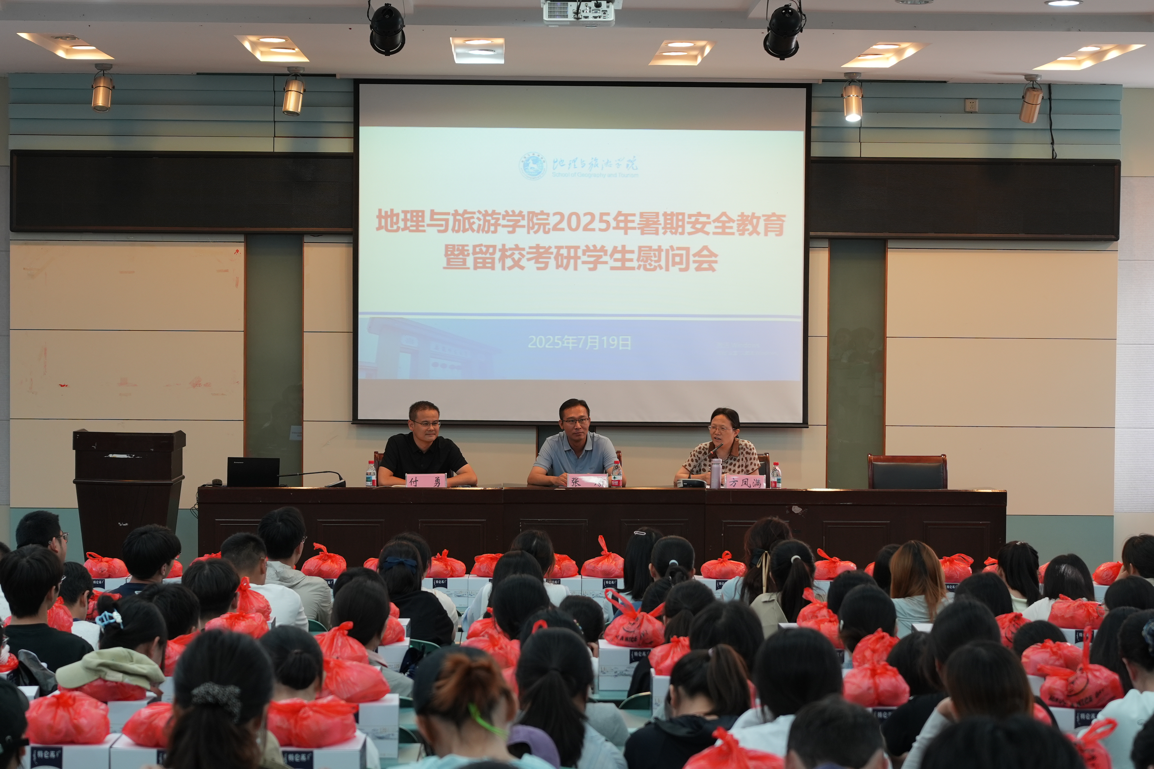 7月19日下午,beat365英国官方网站在实验楼101报告厅召开2025年暑期留校学生安全教育暨考研学生慰问会。学院党委书记张顺、院长方凤满、党委副书记付勇,2026届毕业生辅导员陈祥云,以及全体留校考研学生和竞赛集训学生参加会议。会议由付勇主持。