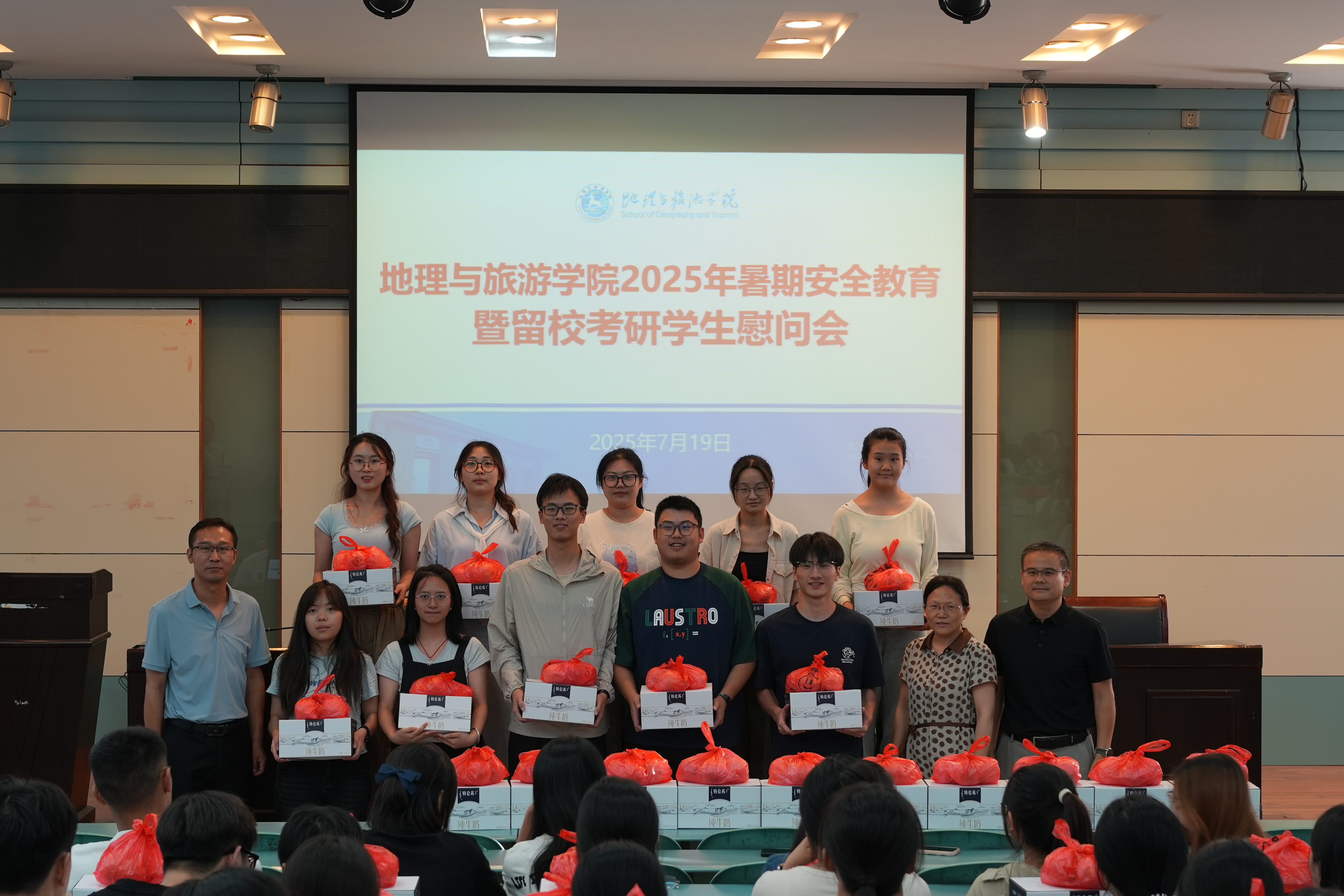会议最后,学院领导和老师为考研和竞赛集训留校学生发放了牛奶、水果等慰问品。