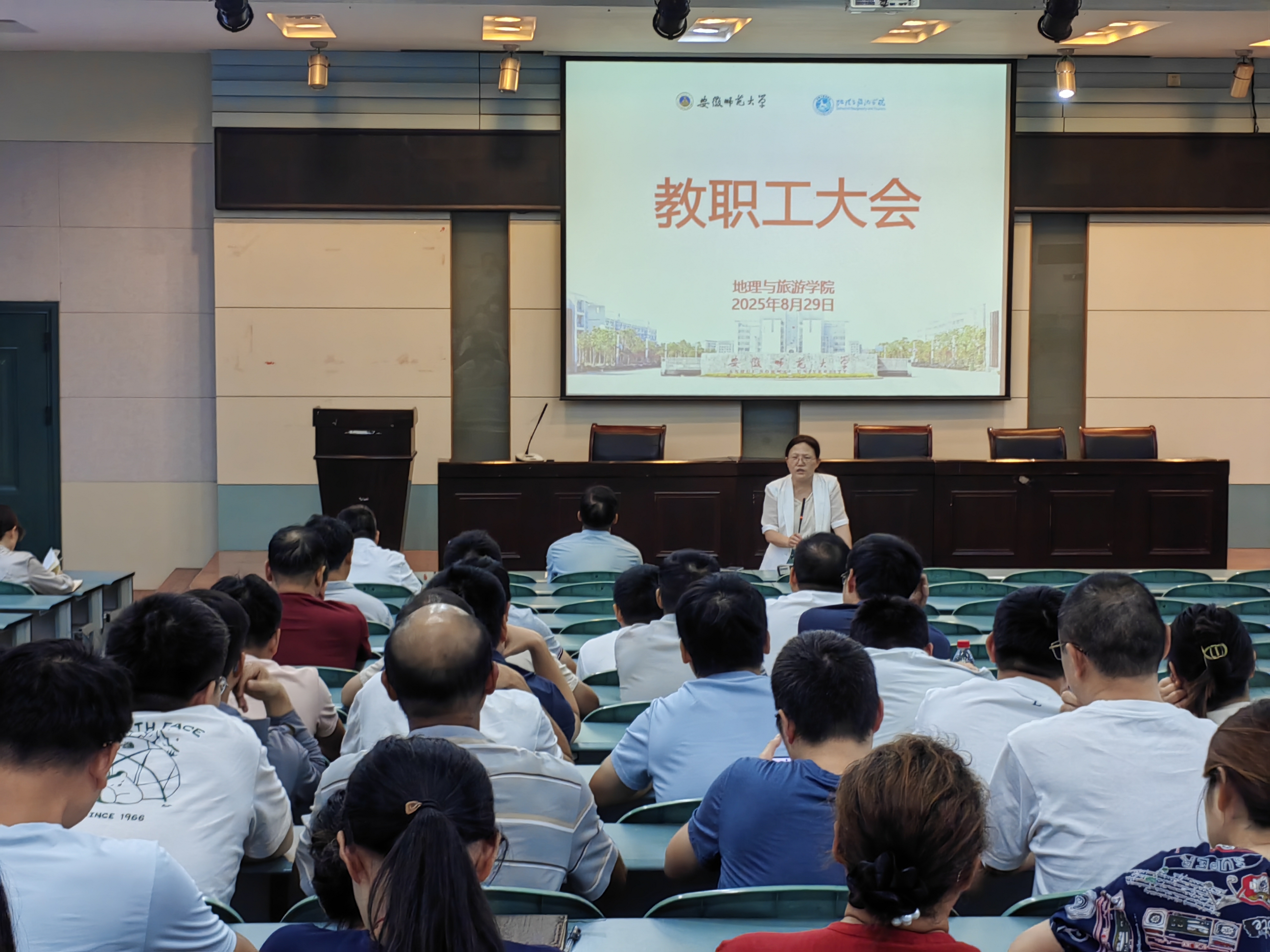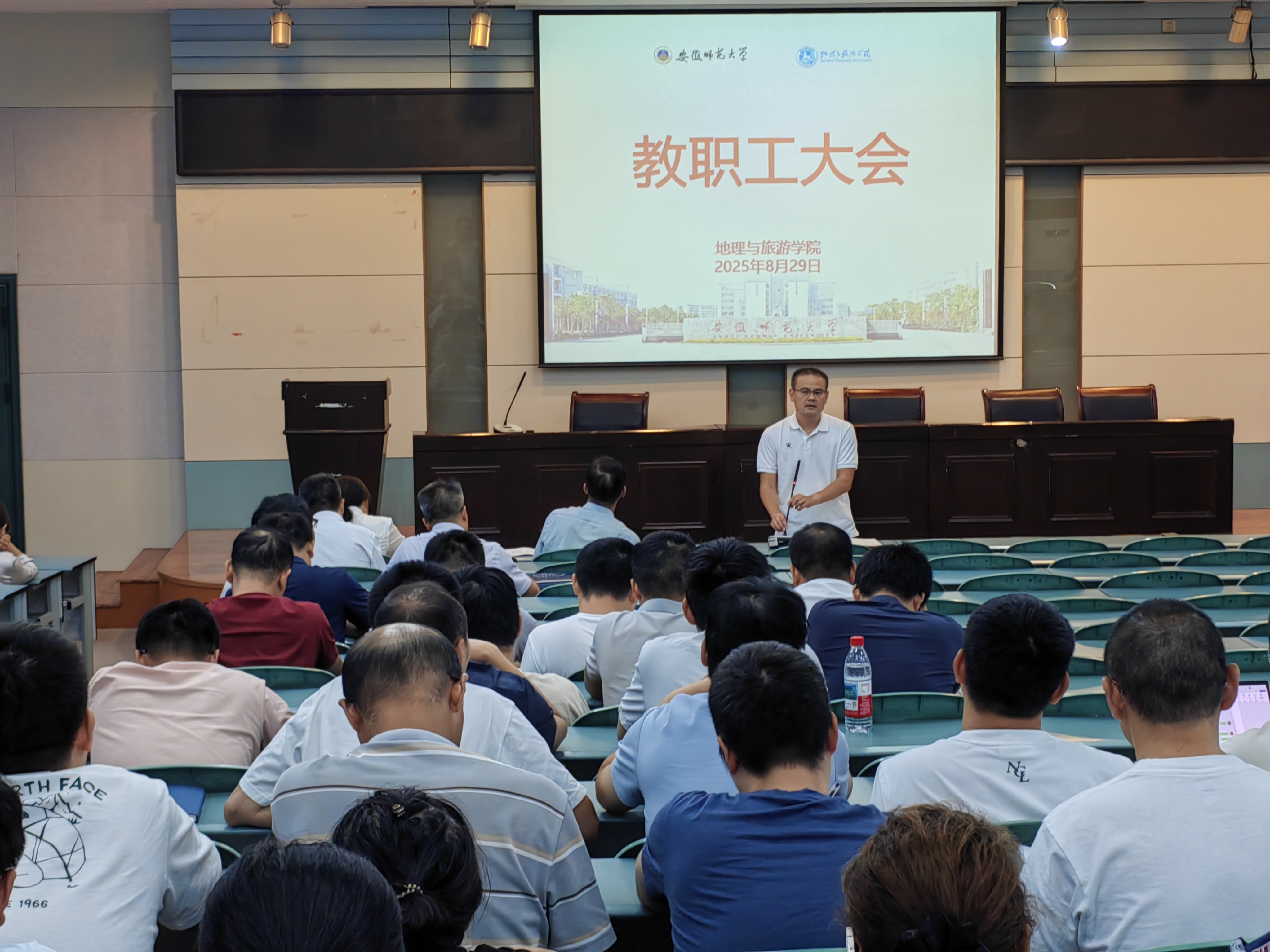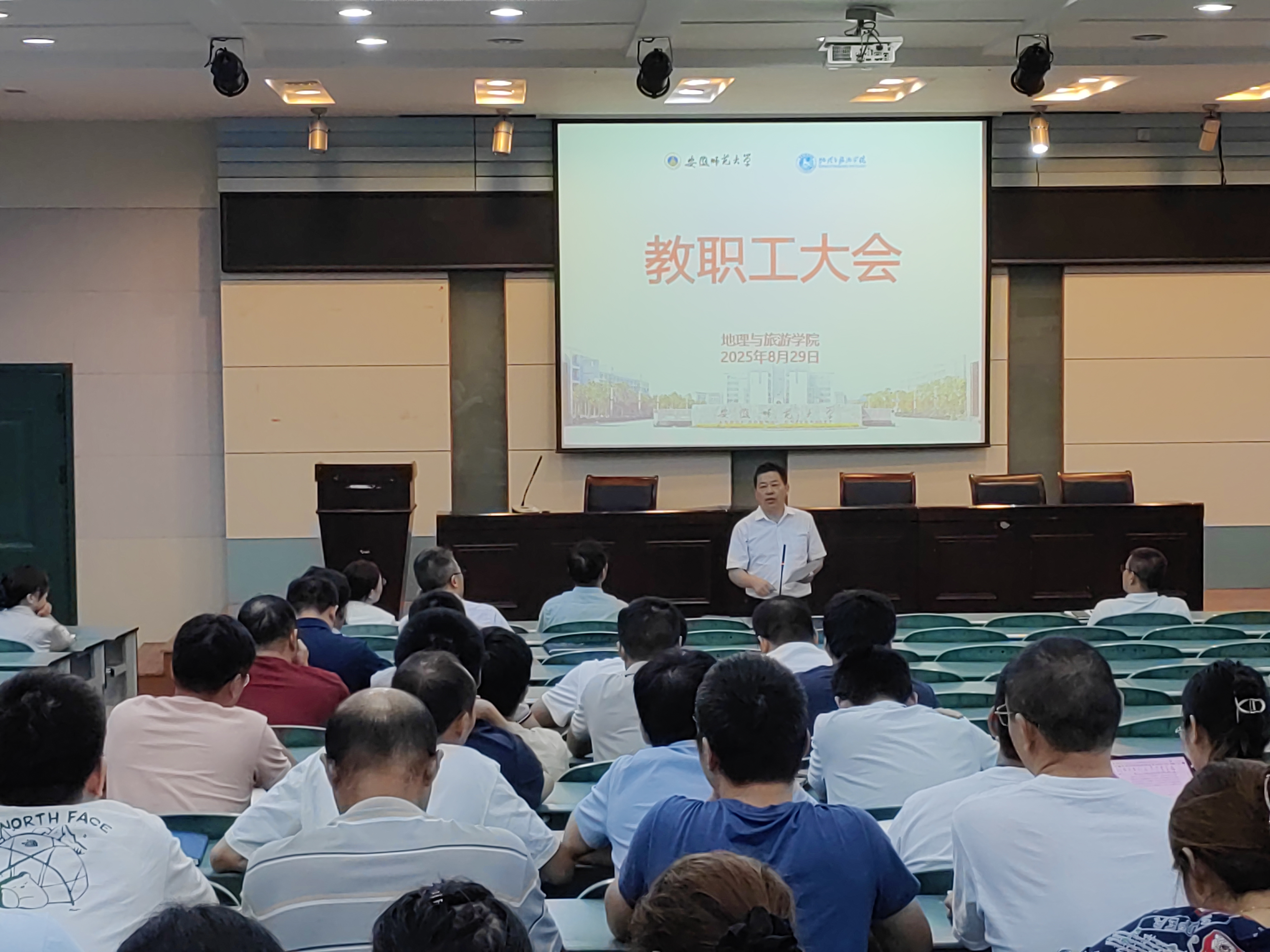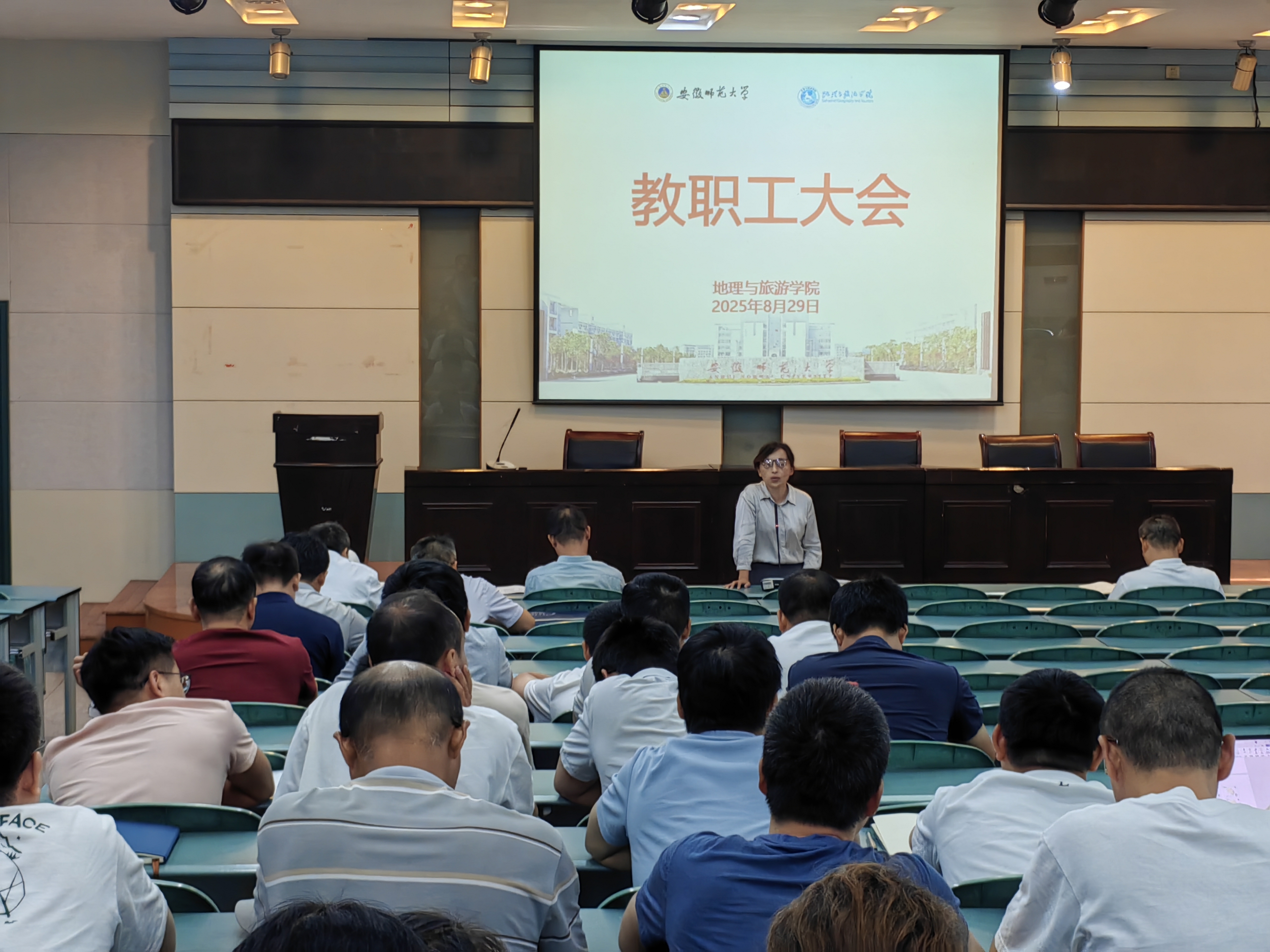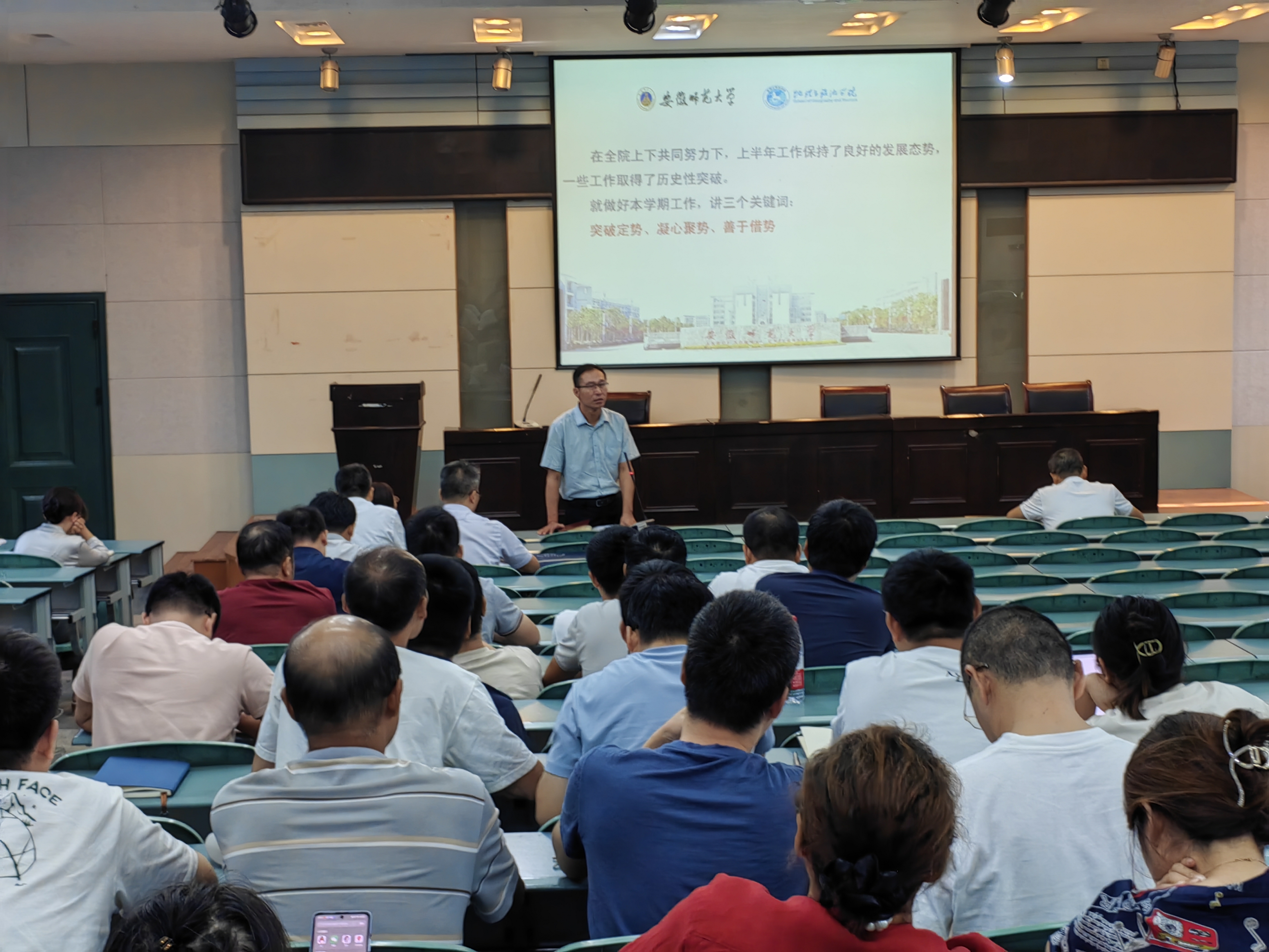 8月29日下午,beat365英国官方网站在学院实验楼101报告厅召开新学期第一次教职工大会,深入学习习近平总书记近期重要讲话和重要指示批示精神,传达学习学校新学期工作会议精神,总结暑期工作,布置新学期工作。学院党政领导班子成员、全体教职工参加会议。会议由院长方凤满主持。