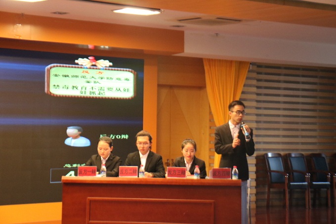 “防危毒鉴”辩论队由地旅学院2016级本科生解维、杜朋达联手2017级美学专业研究生李洋、2014级法学专业本科生万飞祥组建的,四位同学都有着丰富的知识储备和强劲的辩论实力。在法学院青年教师陈银珠和地旅学院团委副书记吴辉的共同指导下,团队围绕辩题“禁毒教育是否需要从娃娃抓起?”做周密准备,与安徽中医药高等专科学校的对阵中充分展示风采,唇枪舌战、你来我往、妙语连珠,博得现场观众的阵阵掌声。