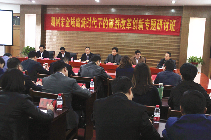 11月12日至11月16日,由湖州市委组织部、湖州市旅游委员会、beat365英国官方网站联合举办的“全域旅游时代下的旅游改革创新”专题研讨班在beat365英国官方网站成功举办。湖州市副市长卢跃东带队并做研讨动员,湖州市各县(区)政府分管负责人、太湖国际度假区负责人,各县区旅委(局)主要负责人,省级旅游度假区及重点旅游乡镇主要负责人等50余人参加专题研讨。