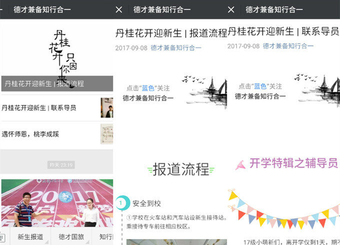 早在新生正式报到之前,国旅学院就发挥新媒体优势,在学院团委的微信公众号“德才兼备 知行合一”中发布了详细的报到流程与2017级辅导员的简介,图文并茂、生动详细,力求以最便捷、最及时的方式为新生入学助力。同时,学院学生会的微博与QQ群也在线上实时为新生提供讯息、答疑解惑。快人一步的线上迎新服务,使得迎新现场更加有条不紊,提高了报到注册的效率。
