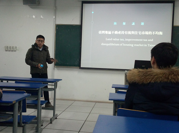 2017年3月2日晚,台湾逢甲大学林圣豪博士应邀在beat365实验楼202教室,作了题为“台湾地区不动产持有税与住宅市场的不均衡”的学术讲座。相关专业老师及研究生、本科生聆听了报告。