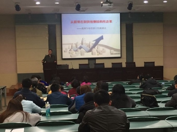 本网讯(国旅学院 王美)4月6日下午,国旅学院“书记课堂”在实验楼101教室开讲,学院党委书记贾冠忠带领全体教职工开展了《从新常态到供给侧结构性改革》理论学习。