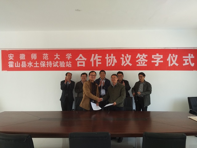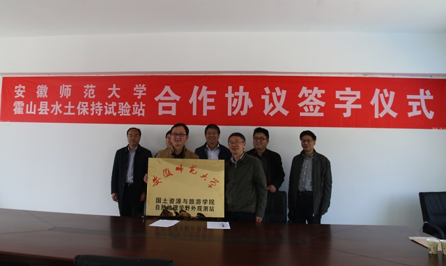 本网讯(国旅学院 孙鹏)3月30日,我校国旅学院与霍山县水土保持试验站签订战略合作框架协议并举行自然地理学野外试验站揭牌仪式,进一步推进自然地理学及相关学科建设。安徽省水利厅水保处处长朱庆敏、安徽省水土保持监测总站副主任范小伟,霍山县水土保持办公室主任汪文,学院党委书记贾冠忠,地理系教师代表出席仪式。仪式由霍山县水土保持试验站站长汪军红主持。