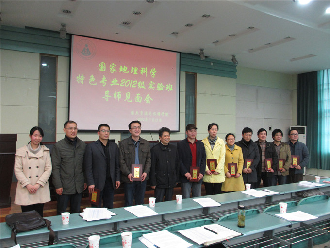 2014315,国家地理科学特色专业2012级实验班导师见面会在实验楼101举行,国家地理科学特色专业建设点负责人、校科研处处长陆林、院党委副书记罗振、地理系主任方凤满、校外导师李志、马辉陵、余保华、校内导师张平究、朱永恒、李俊峰、沈非、高超及辅导员张出席本次大会。