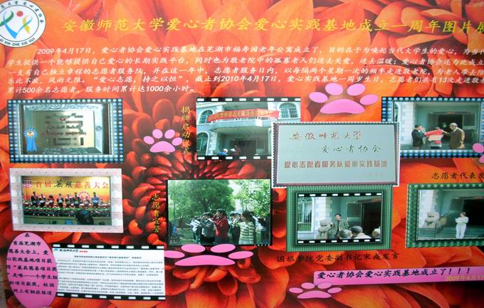 爱心者协会本着“唤起当代大学生的爱心,为其提供一个能够展现自己爱心的舞台”的宗旨,不懈努力,成立了“福寿园老年公寓爱心实践基地”,实现了爱心教育基地化、项目化,并被评选为芜湖市首届慈善节“最具爱心”八大项目之一。(文乐)